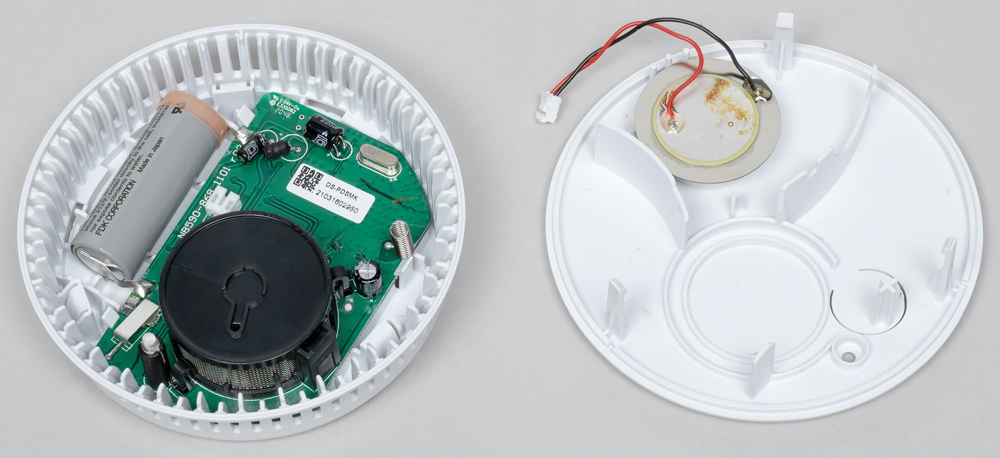 За счет чего же устройство выдает такую громкость? Снова — питание. Разобрав прибор, можно видеть три батареи, расположенные по периметру. Их емкости хватает на 3 года работы устройства, при условии, что сирена будет звучать не чаще, чем один раз в две недели.