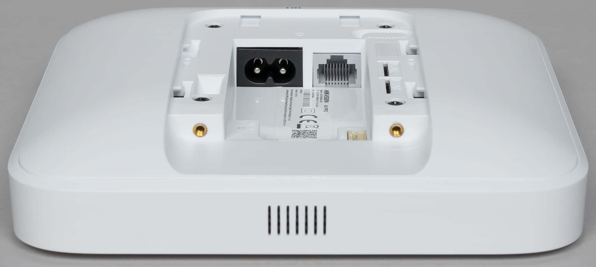 Все интерфейсы прячутся в нише, которая прикрывается сдвижной крышкой. Эта же крышка играет роль крепежной площадки, привинчиваемой к поверхности. Корпус хаба просто надевается на привинченную к стене крышку, а для надежности еще и фиксируется сзади-снизу двумя болтами, невидимыми снаружи. Помимо привычного входа питания и LAN-порта, в этом технологическом углублении расположены реле защиты от вскрытия, кнопка сброса устройства, переключатель питания, два последовательных порта и два слота для SIM-карт мобильной связи.