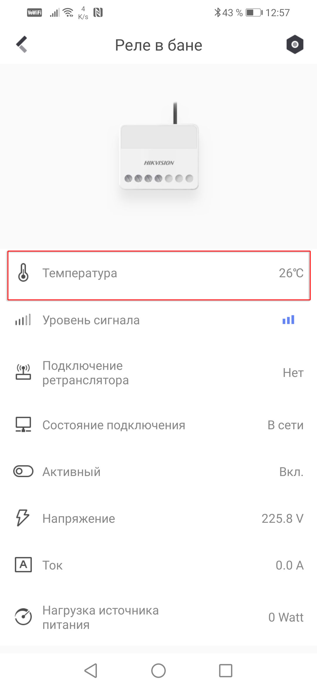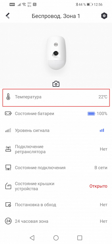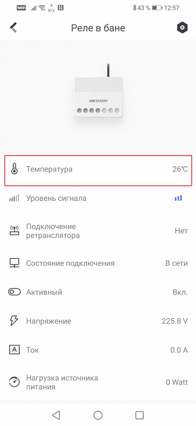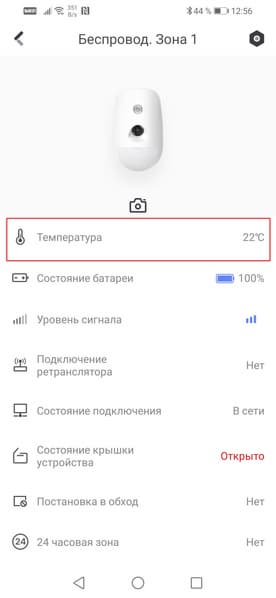 Раз уж мы вспомнили о температуре, то следующий важный момент, который нужно упомянуть — это наличие в каждом датчике температурного сенсора. Не только в хабе, но в датчиках. И даже в реле-переключателе. Зачем они нужны, сенсоры? Ну, например, с их помощью можно увидеть температуру в месте установки устройства. Вот они, эти строчки, обведены красным.
