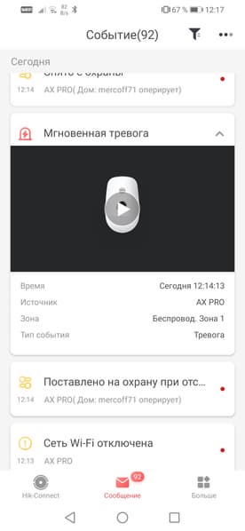 Теперь о главном. Ну, одном из главных. О реакции системы охраны на тревогу. Главное ее преимущество — то, что она практически мгновенна. Даже при плохой связи с отлучившимся хозяином, на его смартфон тут же приходят оповещения с описанием типа тревоги. Будь то протечка, открытие двери, вторжение или задымление. Оповещения поступают как в виде push-уведомлений, так и находятся в списке событий самого приложения.