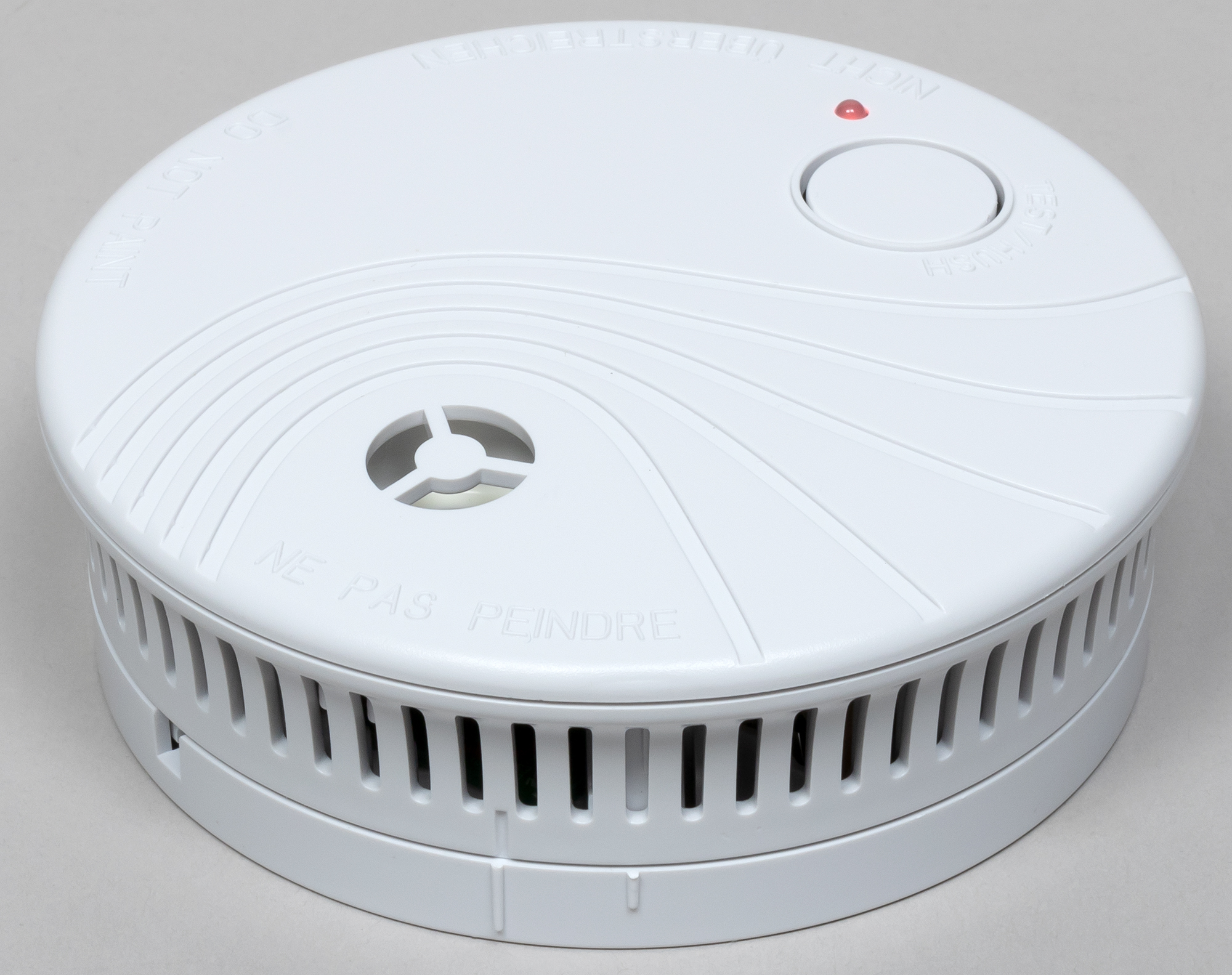 А вот способ контроля за наличием дыма во всех подобных датчиках могут быть совершенно разными. Например, может использоваться вариант контроля за прозрачностью воздуха внутри камеры слежения, находящейся в устройстве. Если между источником света и сенсором оказывается дым или воздух с мелкими непрозрачными включениями — интенсивность лучика меняется и датчик поднимает тревогу. Крупное отверстие для свободного входа воздуха можно видеть на лицевой стороне корпуса. На противоположной стороне, рядом с красным светодиодом, расположена решетка встроенного оповещателя, она же работает как кнопка тестирования жутко громкой сирены. Не позавидуешь тому, кто окажется под ней, работающей.