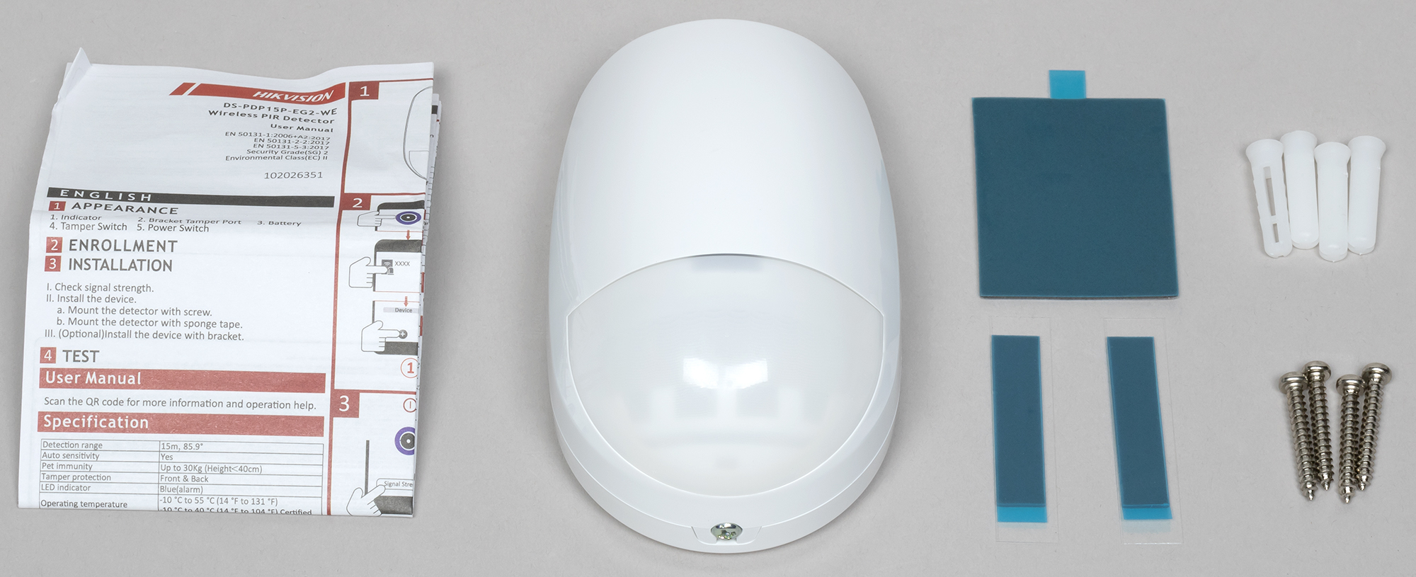 Комплектность копирует таковую у обычного PIR-датчика, здесь все тот же крепежный набор, состоящий из дюбелей с саморезами, а также клейких пластинок.