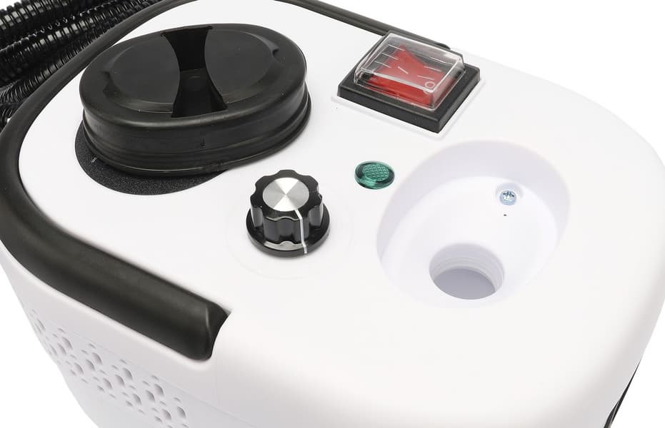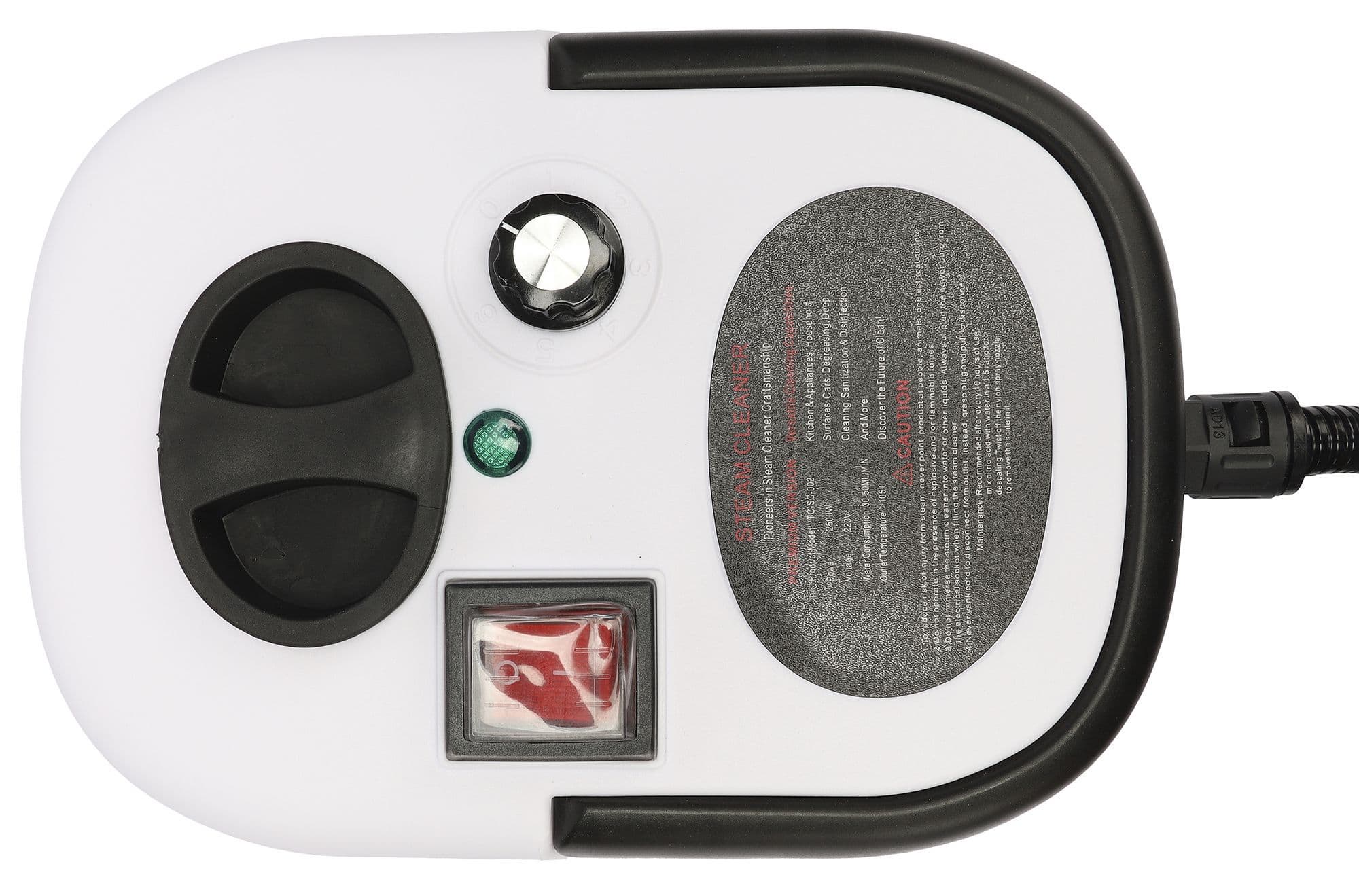 Управление пароочистителем Hiomee предельно простое — разобраться можно даже без инструкции. На корпусе расположена красная кнопка питания, которая отвечает за включение и выключение устройства. Чуть выше находится зеленый индикатор, небольшой по размеру, он загорается, когда пароочиститель включен и готов к работе.