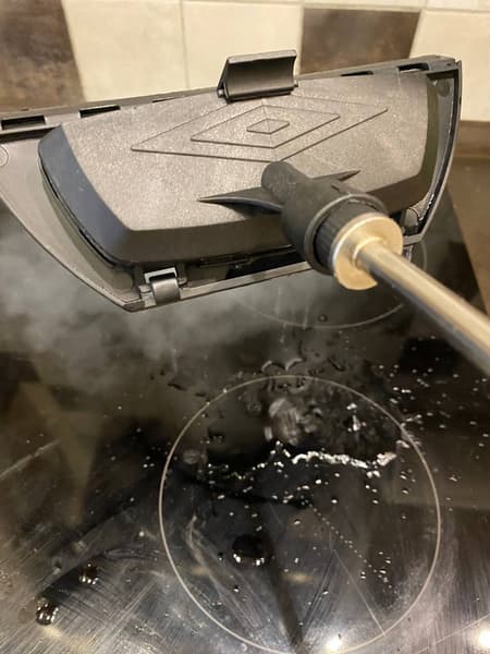 Во время работы устройства подача пара была чрезмерно интенсивной: струя шла с большим объемом влаги, и вместо направленного очищения поверхность буквально заливалась горячим конденсатом. Пара было действительно много: видимость ухудшалась, и приходилось останавливаться, чтобы убрать излишки влаги с поверхности.
