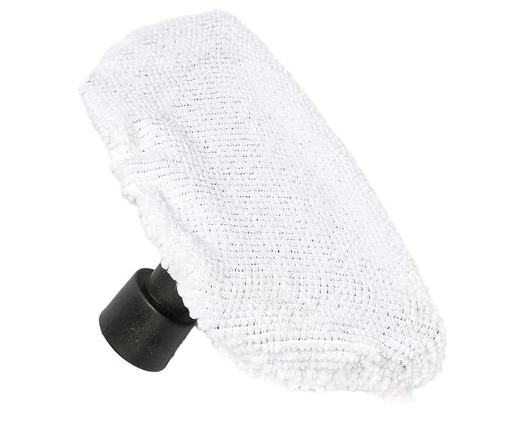 Малая форма, по инструкции, предназначена для работы с окнами, и на нее можно дополнительно надеть тканевое полотенце из микрофибры. Именно в малой насадке предусмотрена рукоятка, которая крепится к устройству. Это значит, что если мы используем насадку только как скребок для стекол и зеркал, мы работаем без микрофибры, используя ее в режиме «два в одном». А если нам нужно отпаривание или протирка поверхности после очистки от воды, тогда используем малую насадку с микрофибровой тканью, которая позволяет аккуратно вытереть и высушить стекло. По размерам она сопоставима примерно с двумя ватными дисками — представьте, насколько реально можно вытереть поверхность и насколько насухо. Эта насадка подходит только для локальной работы на небольших участках — примерно несколько квадратных дециметров за один подход. Для уборки больших поверхностей ее использование неэффективно, и включать пароочиститель для таких задач будет неудобно. В итоге ее заявленные функции по удалению влаги и полировке выглядят скорее формальными, чем реально работающими, и не подходят для серьезных работ.