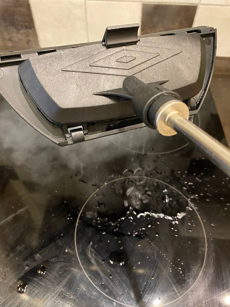 При этом эффективного очищения мы не заметили: загрязнения и разводы остались на месте. К тому же поверхность вокруг панели начала активно намокать, что вызвало опасения за возможное попадание излишней влаги на соседние участки столешницы. После того как видимого эффекта от работы пароочистителя мы так и не получили, а количество влаги на стеклокерамике стало избыточным, мы решили остановить эксперимент, чтобы избежать возможных повреждений поверхности.