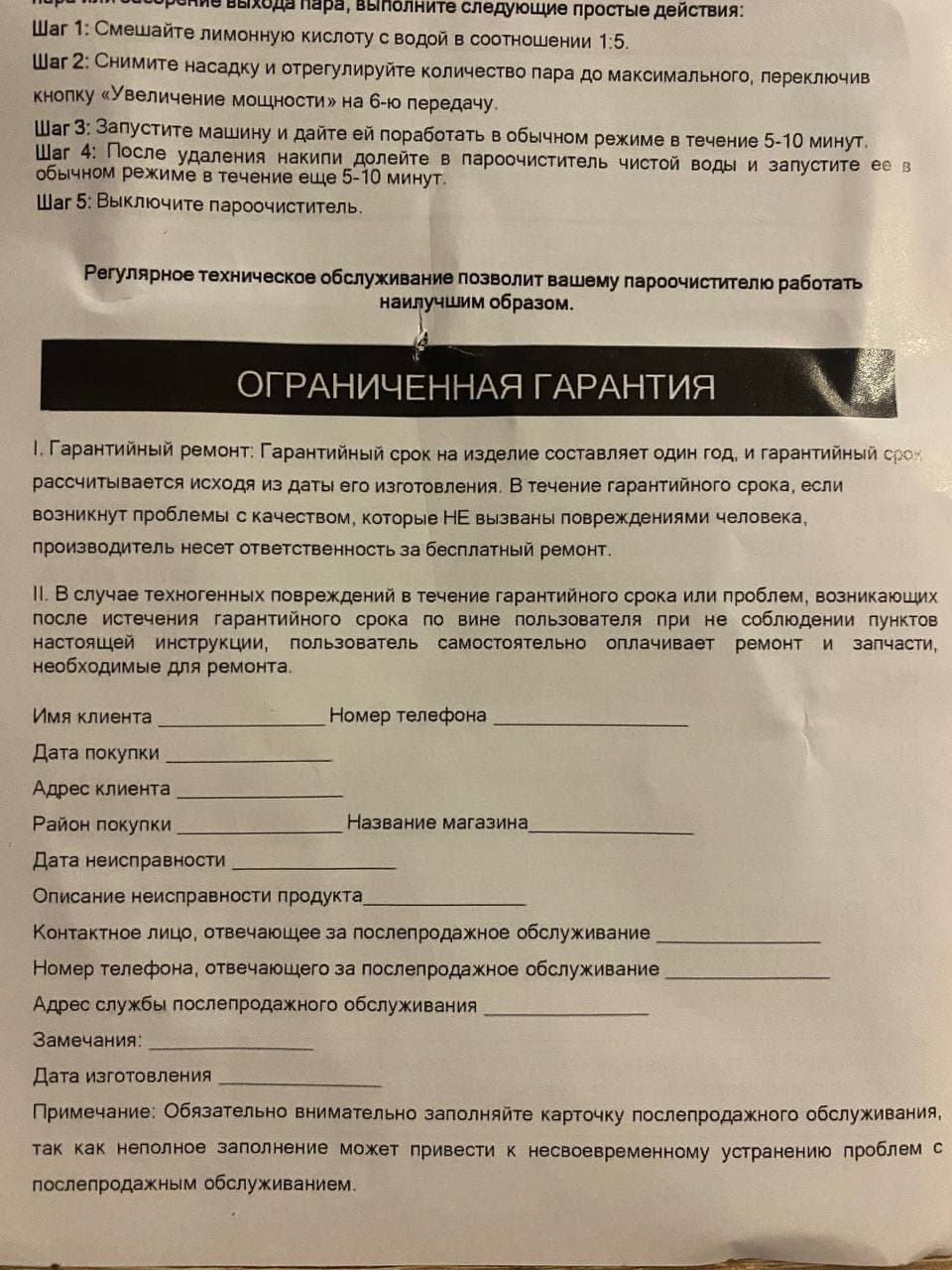 В инструкции в разделе «Техническое обслуживание и уход» производитель уделяет внимание предотвращению образования накипи в пароочистителе. Это важно для поддержания непрерывной работы пара при высокой температуре и сохранения производительности устройства.