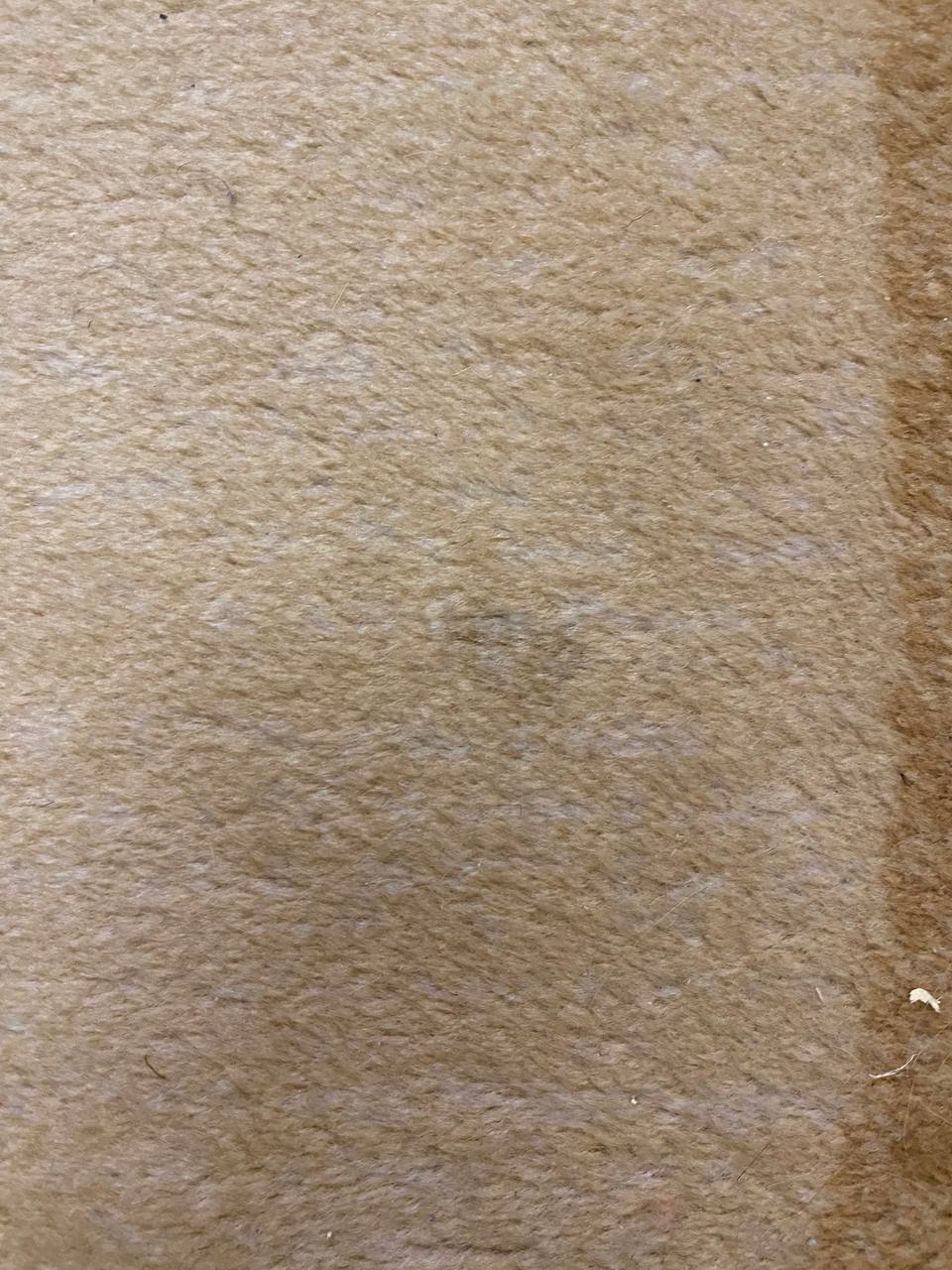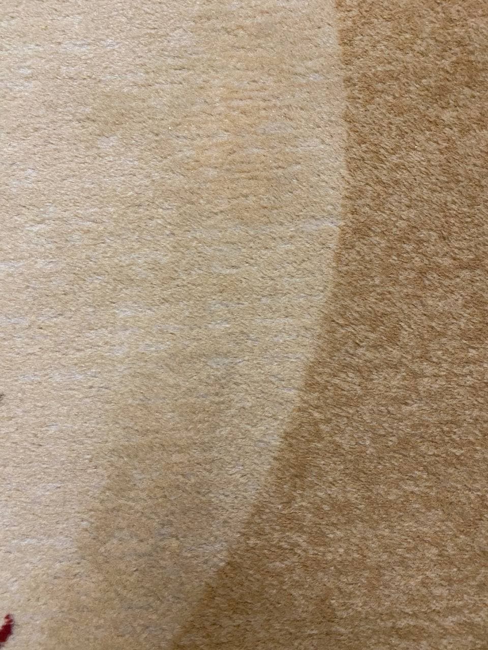 На фото видно слегка изменившийся фон ковра в местах, где проводилась очистка: здесь расположены два очищенных пятна. После высыхания мы отметили, что участки ковра, подвергшиеся обработке, слегка изменили оттенок, стали чуть светлее, словно слегка выцвели. Это подтверждает рекомендацию производителя: перед обработкой ковров или тканевых поверхностей следует протестировать прибор на небольшом участке, чтобы убедиться, что материал не изменит цвет.