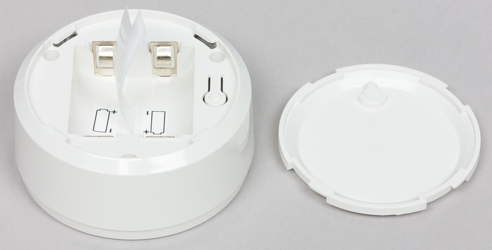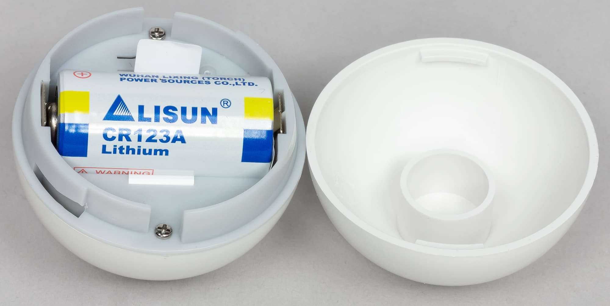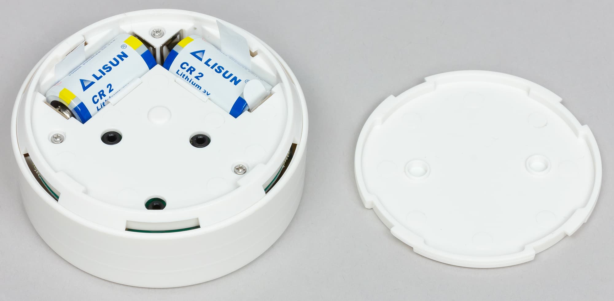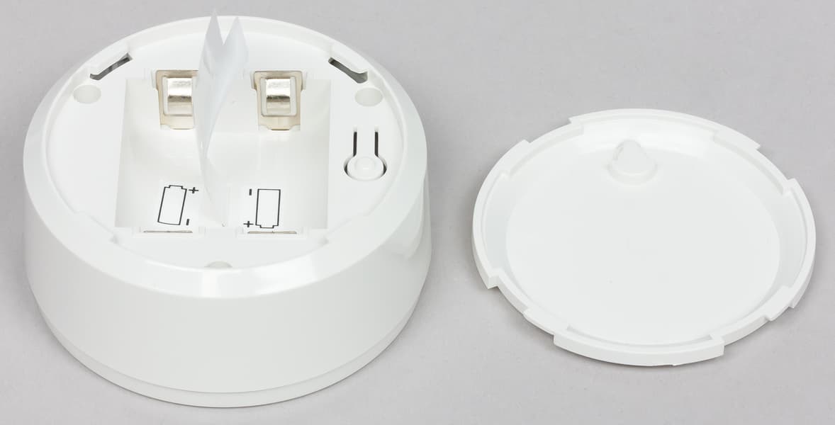 Крышка снимается поворотом по часовой стрелке. Внутри — два слота для батареек CR123A, с помощью которых можно организовать резервное питание. Там же находится кнопка для начала подключения к сети.