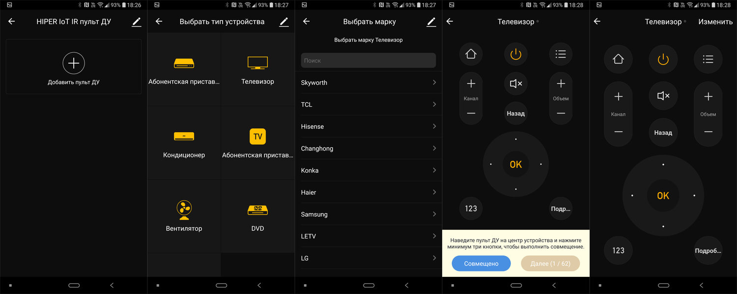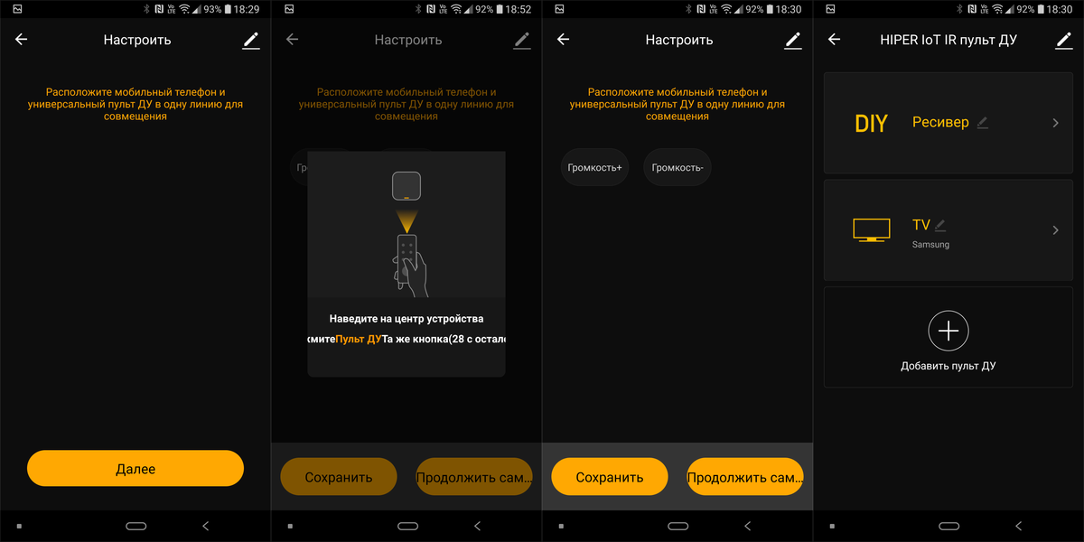 Далее приложение немного вводит в заблуждение — предлагает расположить мобильный телефон и пульт ДУ в одну линию. Речь, конечно же, вновь про «родной» пульт ДУ и универсальный. Располагаем, нажимаем «Далее». После чего нажимаем нужную кнопку на исходном пульте, она записывается в память ПДУ Hiper. Сохраняем — подписываем, идем дальше.