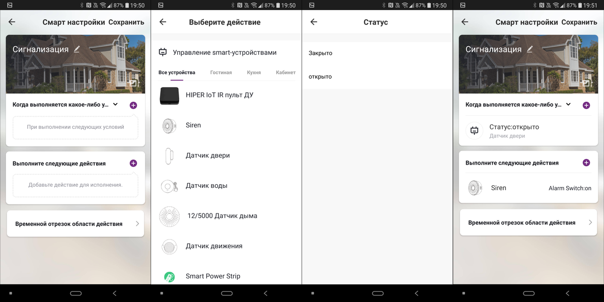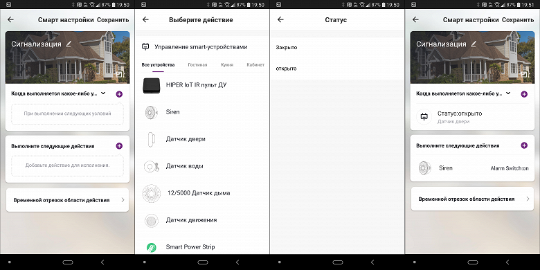 Ну и, как было обещано чуть выше, создадим сигнализацию открытия — свяжем соответствующий датчик и сирену. Добавляем сценарий, редактируем имя и картинку. В качестве условия выбираем статус «Открыто» у датчика, а в качестве результата — включение сирены.