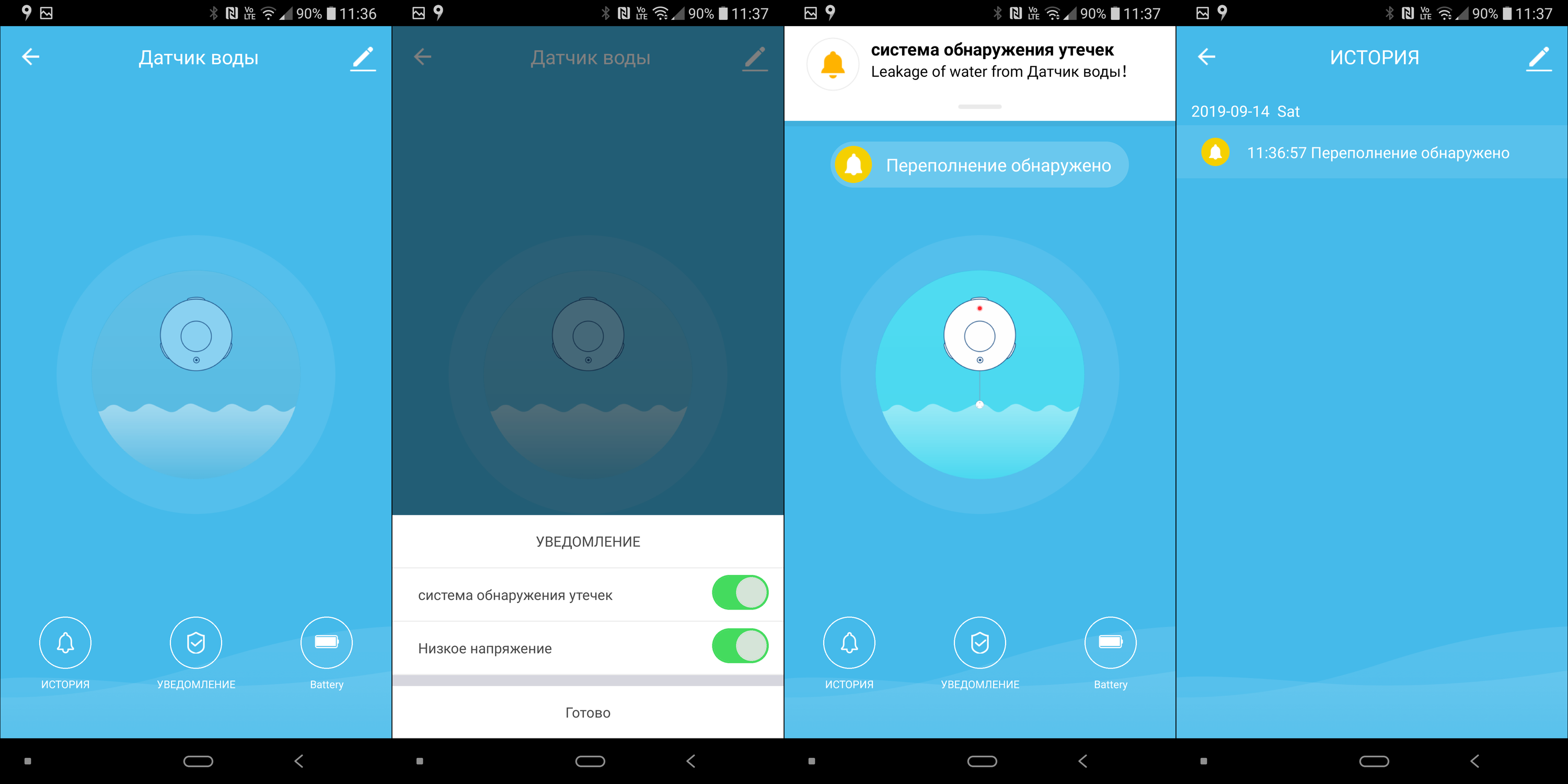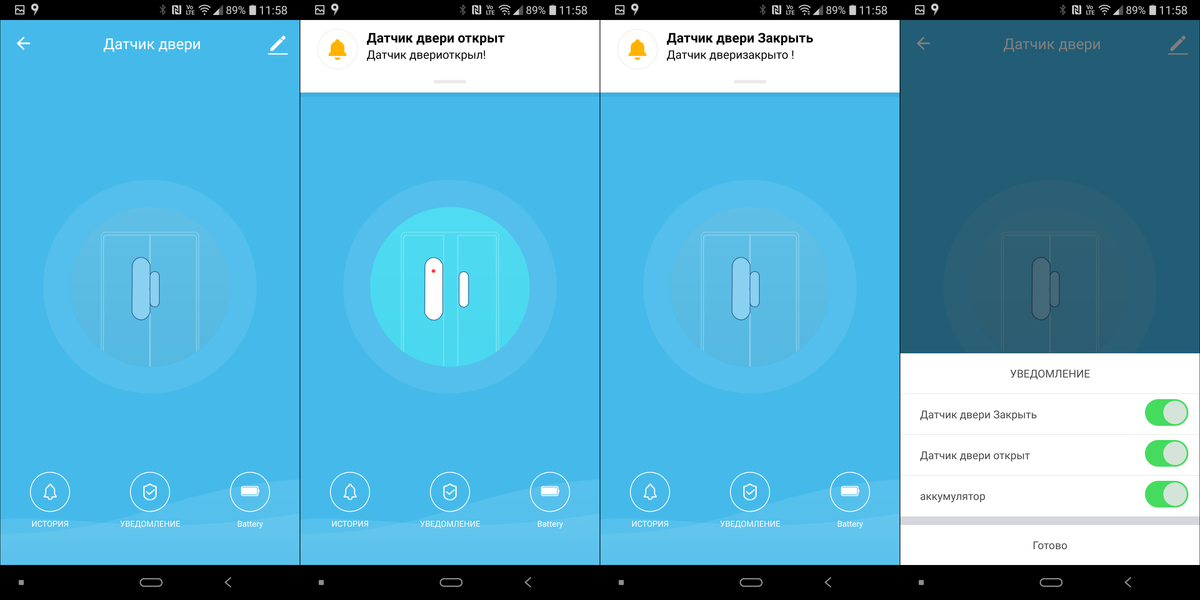 После срабатывания в приложение приходит уведомление, которое можно отключить. Срабатывания видны в истории — все как у датчиков, которые мы рассматривали выше.