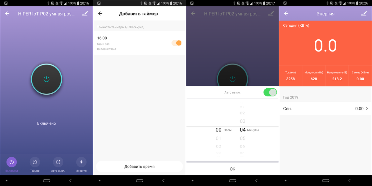 IoT P02 немного дороже более бюджетной версии, но при этом предлагает пользователю сразу несколько интересных бонусов. Максимальный ток ощутимо выше — 16 А. В приложении помимо стандартных функций есть кладка «Энергия», где собрана масса интересной информации: ток, мощность, напряжение, потребленные киловатт-часы. По потреблению со временем накапливается статистика, которую можно увидеть в отдельной вкладке.