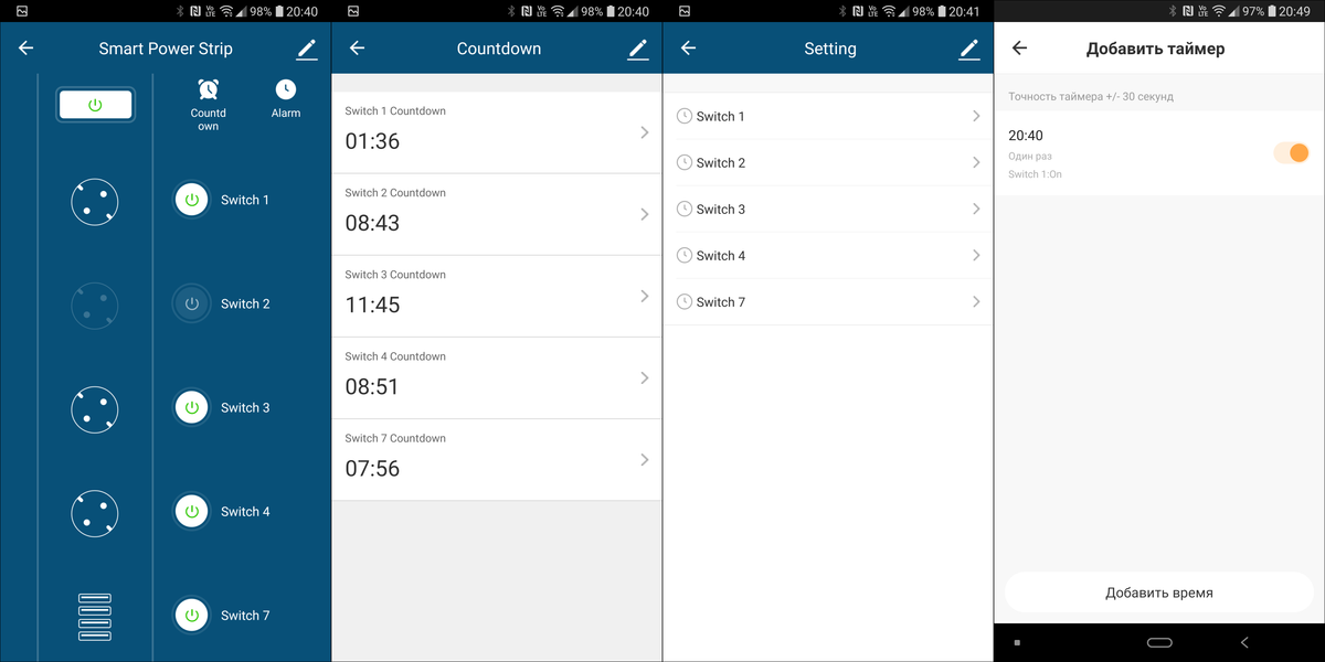 Каждая из розеток устройства может отдельно включаться и выключаться из приложения, в том числе — по таймеру и расписанию. Группа USB-выходов также имеет свой выключатель. После выключения и включения питания фильтра все его розетки возвращаются в выключенное состояние.