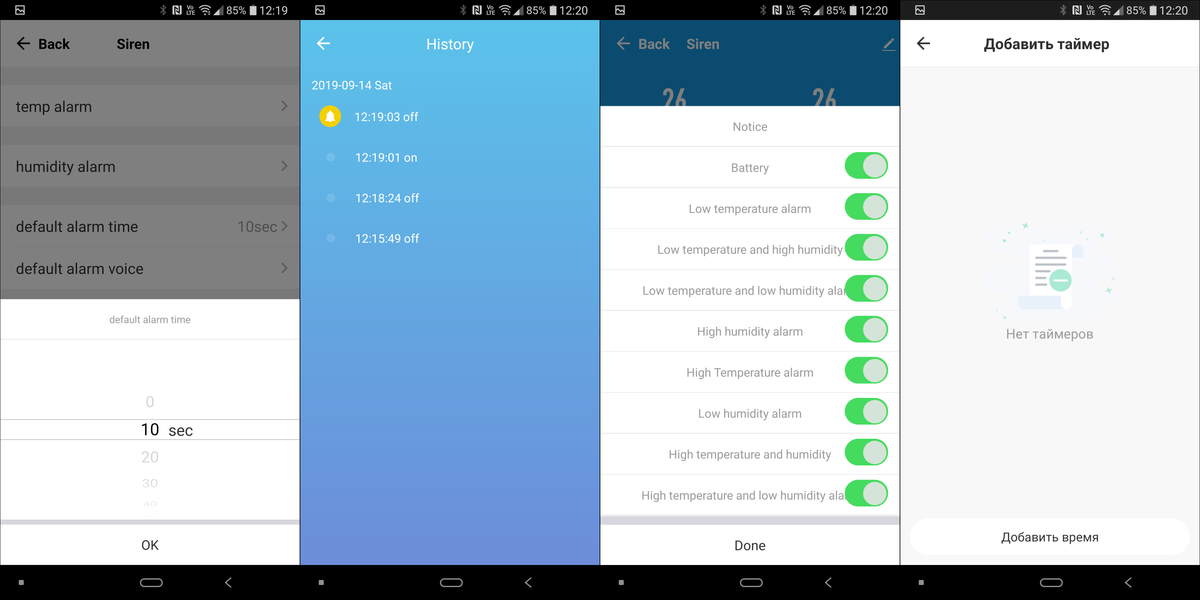 Также можно настраивать продолжительность звучания сигнала, просматривать историю срабатываний, настраивать 9 вариантов сообщений, а также добавлять таймеры срабатывания.