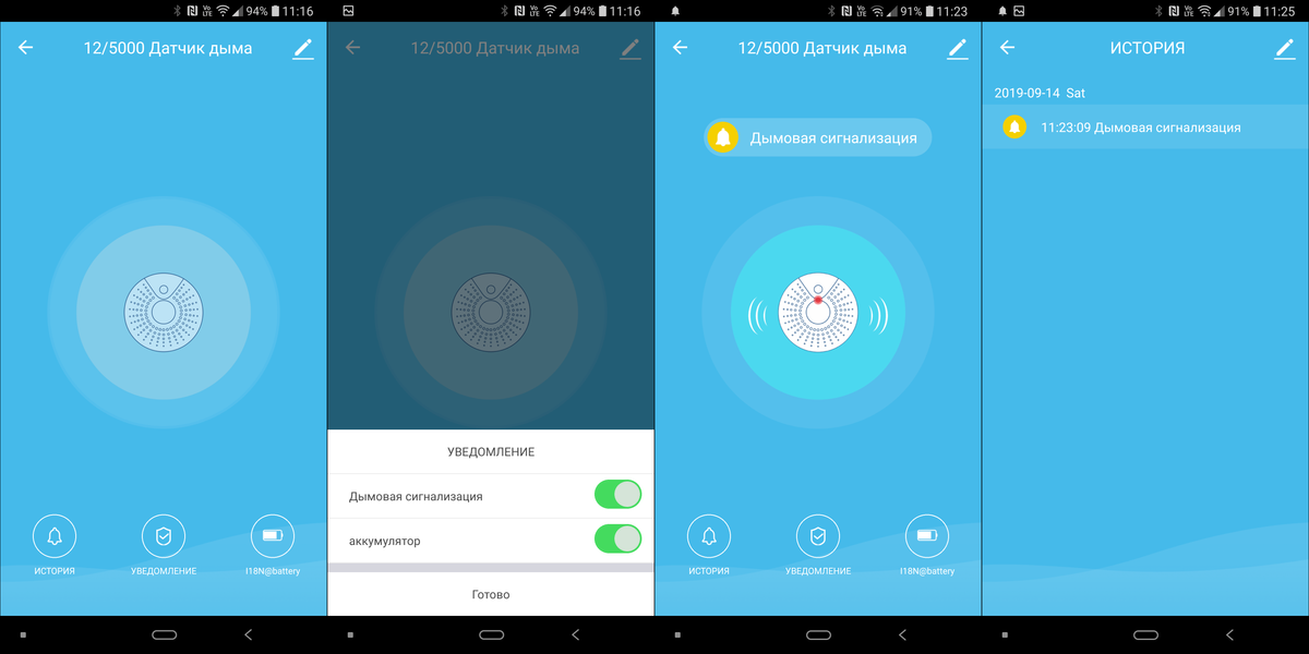Датчик не отличается излишней чувствительностью и не беспокоит пользователя ложными срабатываниями, в том числе — в помещениях, где активно курят. При появлении серьезного задымления срабатывает звуковое оповещение, плюс приходит уведомление на гаджет с установленным приложением Hiper IoT. Уведомления также настраиваются, история срабатываний доступна в отдельной вкладке.