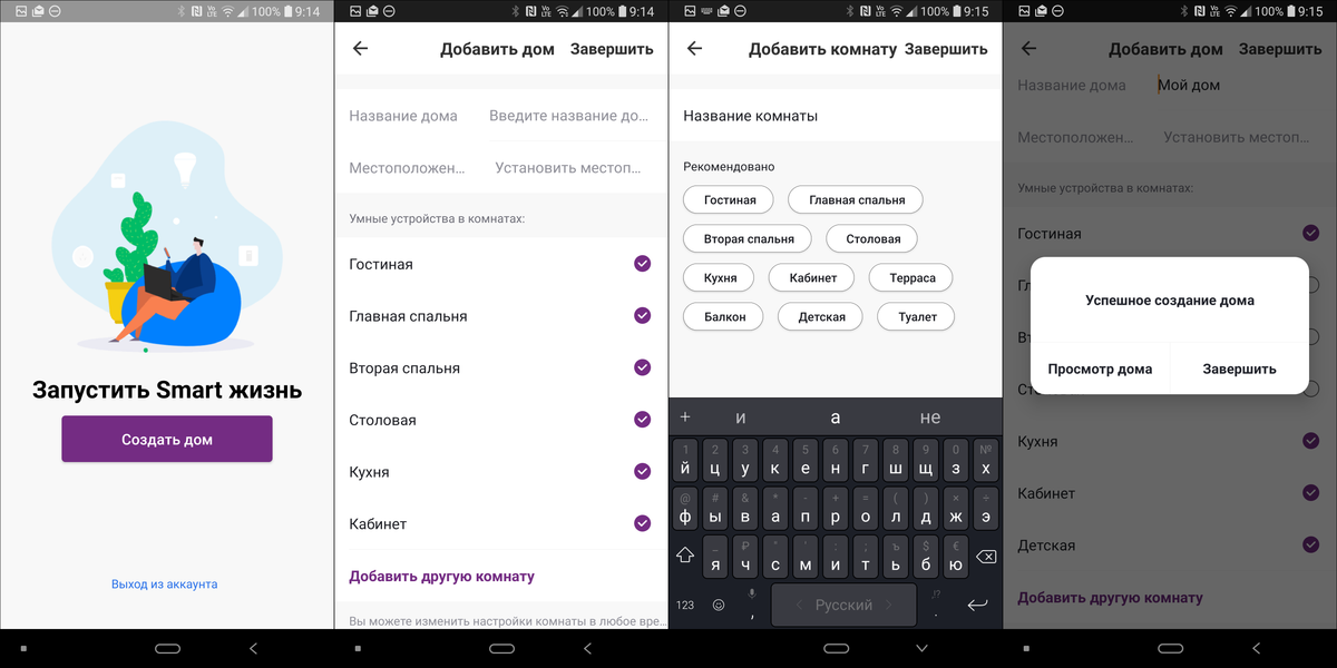 Далее нам нужно «создать дом» — ввести его название, добавить нужные комнаты. Управлять подключенными устройствами можно не только из домашней сети — они «привязываются» к аккаунту, после чего удобно сортируются по домам и комнатам.