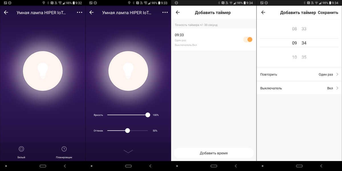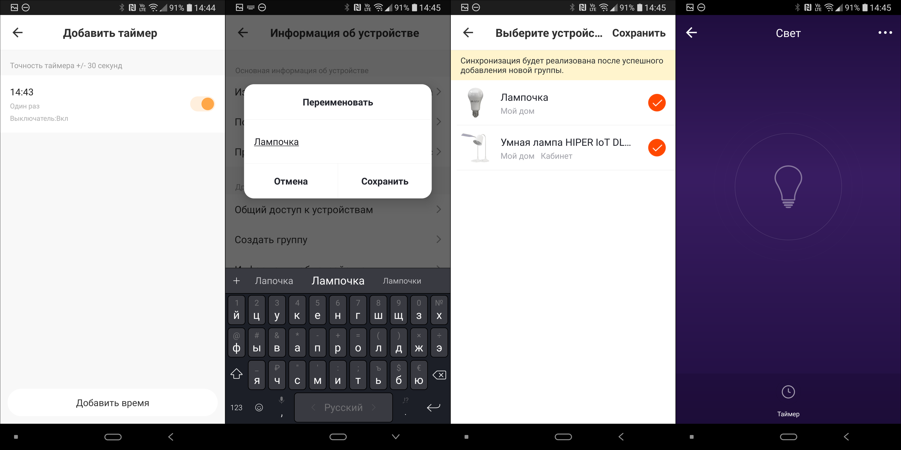 Естественно, в настройках можно добавить таймер включения-выключения, также отметим возможность переименовать устройство. Как только приборов становится больше одного — их можно объединять в группы. Например, нашу лампочку и светильник мы собрали в группу «Свет», после чего получили возможность включать и выключать их вместе — из одной вкладки в приложении, а также настраивать общий таймер.