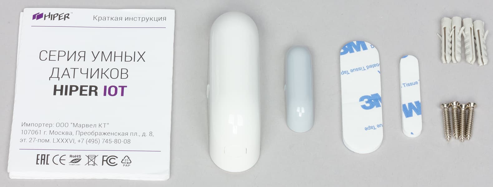 И снова сначала про комплектацию. Инструкция, набор для крепления, сам датчик — традиционно. Плюс магнитная накладка, обеспечивающая срабатывание.