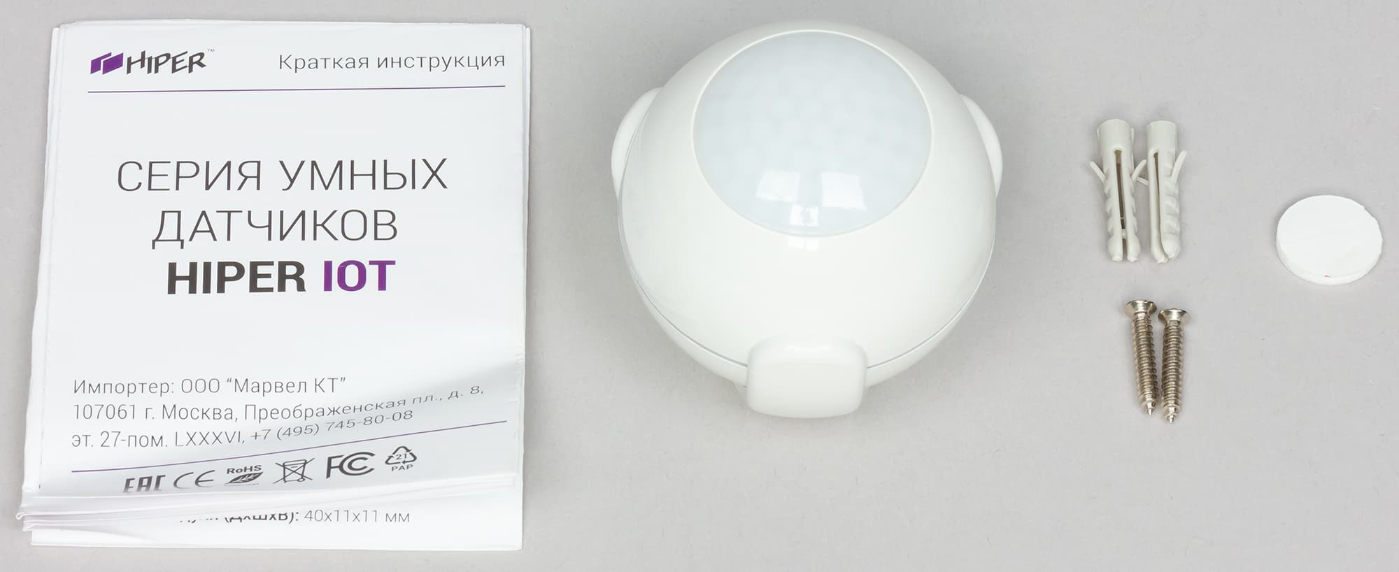 В комплект поставки входит непосредственно датчик, инструкция и набор для крепления.