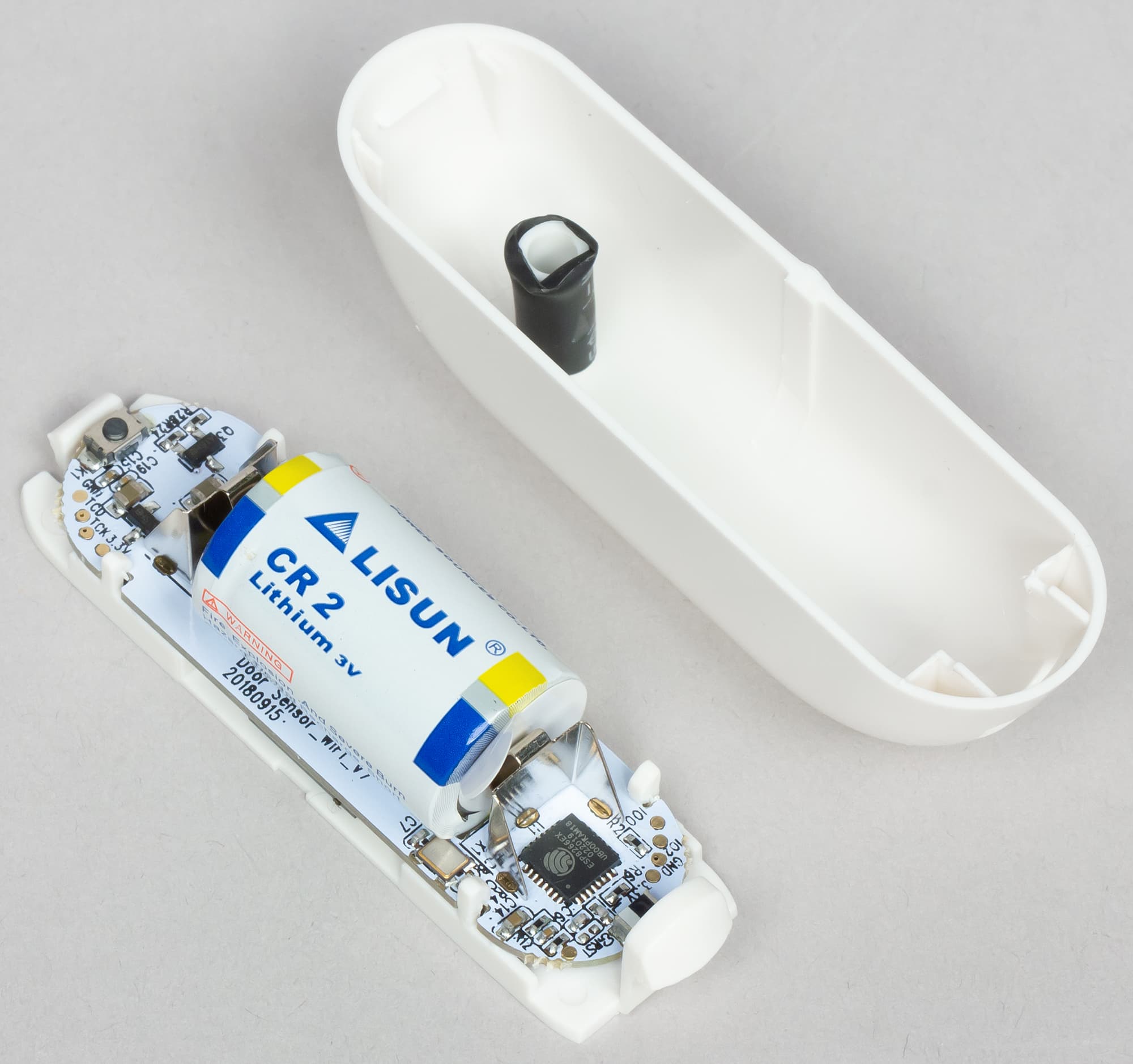 Крышка датчика держится на двух умеренно тугих защелках. Сняв ее, видим прикрепленную к основанию плату, на которой находятся батарея питания и маленькая кнопка активации режима соединения.