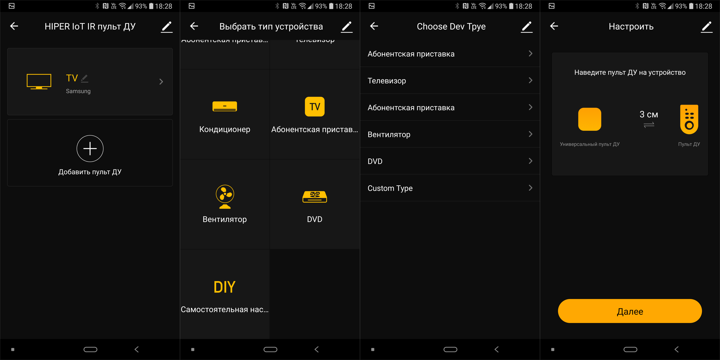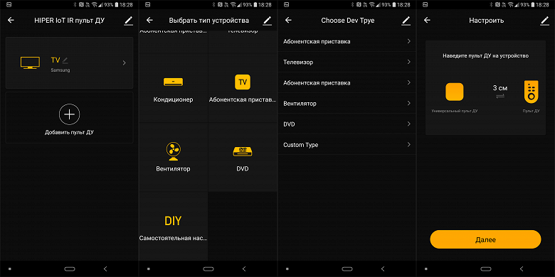 У Hiper возможность «обучения» пульта есть. Для этого вновь входим в меню добавления нового ПДУ, где переходим в раздел самостоятельной настройки — DIY. Выбираем тип устройства, если нужного типа нет — выбираем Custom Type. Часть процесса не переведена на русский, но разобраться несложно. Наводим «родной» пульт от управляемого устройства на наш универсальный пульт Hiper.