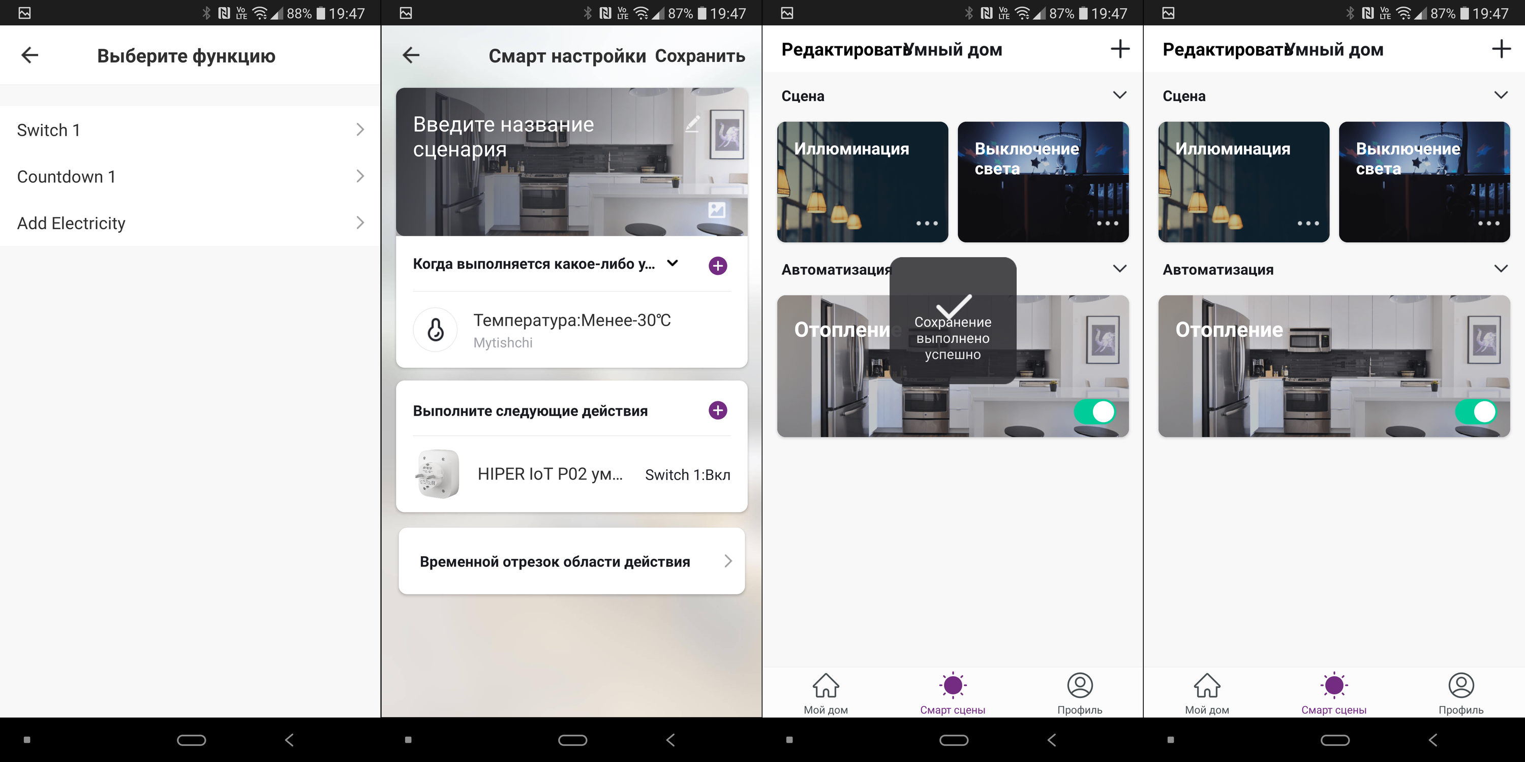 Возможности автоматизации у «умного дома» Hiper достаточно обширны. Все действия можно собирать в единые «цепочки», называемые сценами или сценариями. Для примера создадим сценарий, включающий несколько световых приборов. Заходим во вкладку «Смарт-сцены», нажимаем на кнопку добавления сценария. Сразу редактируем название.