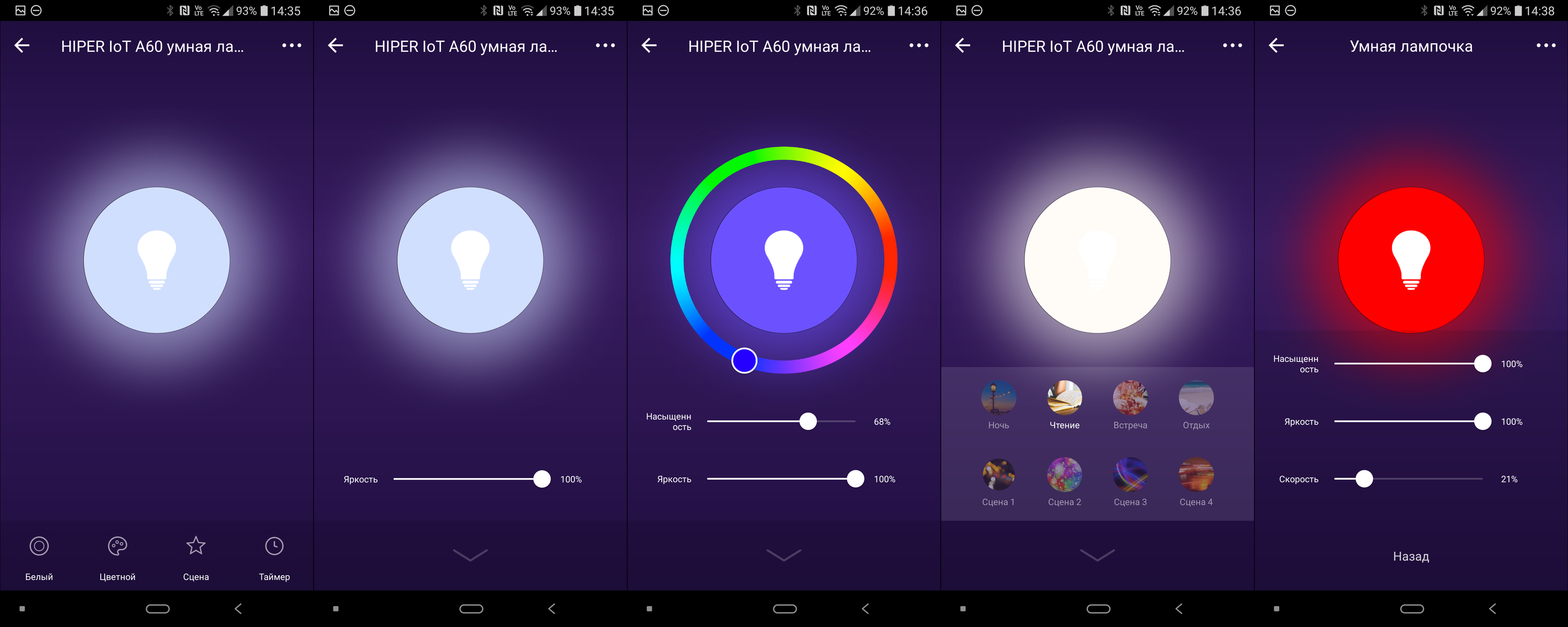 В приложении лампу можно включать и выключать, настраивать яркость и цвет. Во вкладке «Сцена» можно выбирать заранее предустановленные профили, а также создавать свои. При этом возможно настроить не только статичные яркость и цвет, но и мерцание или плавную смену цвета.