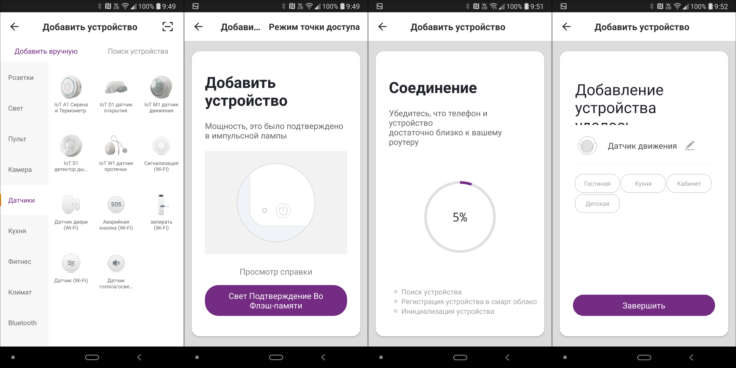 Процесс подключения датчиков практически идентичен подключению других устройств. Кстати, надо отметить, что различных приборов в этом меню крайне много — видно, что планы по развитию этого направления у Hiper серьезные. Далее активируем режим сопряжения и по желанию добавляем датчик в одну из комнат.
