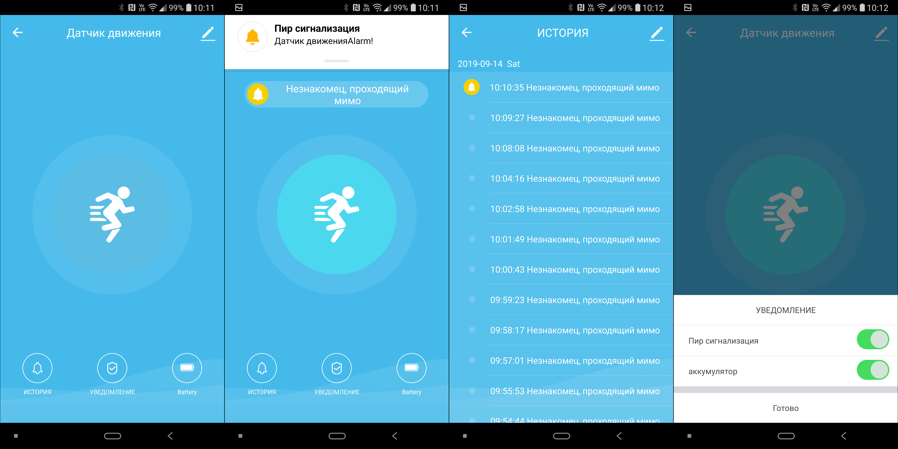 Он тут же активируется и переходит в «следящий» режим. При срабатывании на телефон приходит соответствующее оповещение, значок в приложении начинает подсвечиваться. Историю срабатываний можно увидеть в отдельной вкладке. Спустя несколько секунд после прочтения сообщения датчик вновь готов к работе — подсветка иконки в приложении отключается.