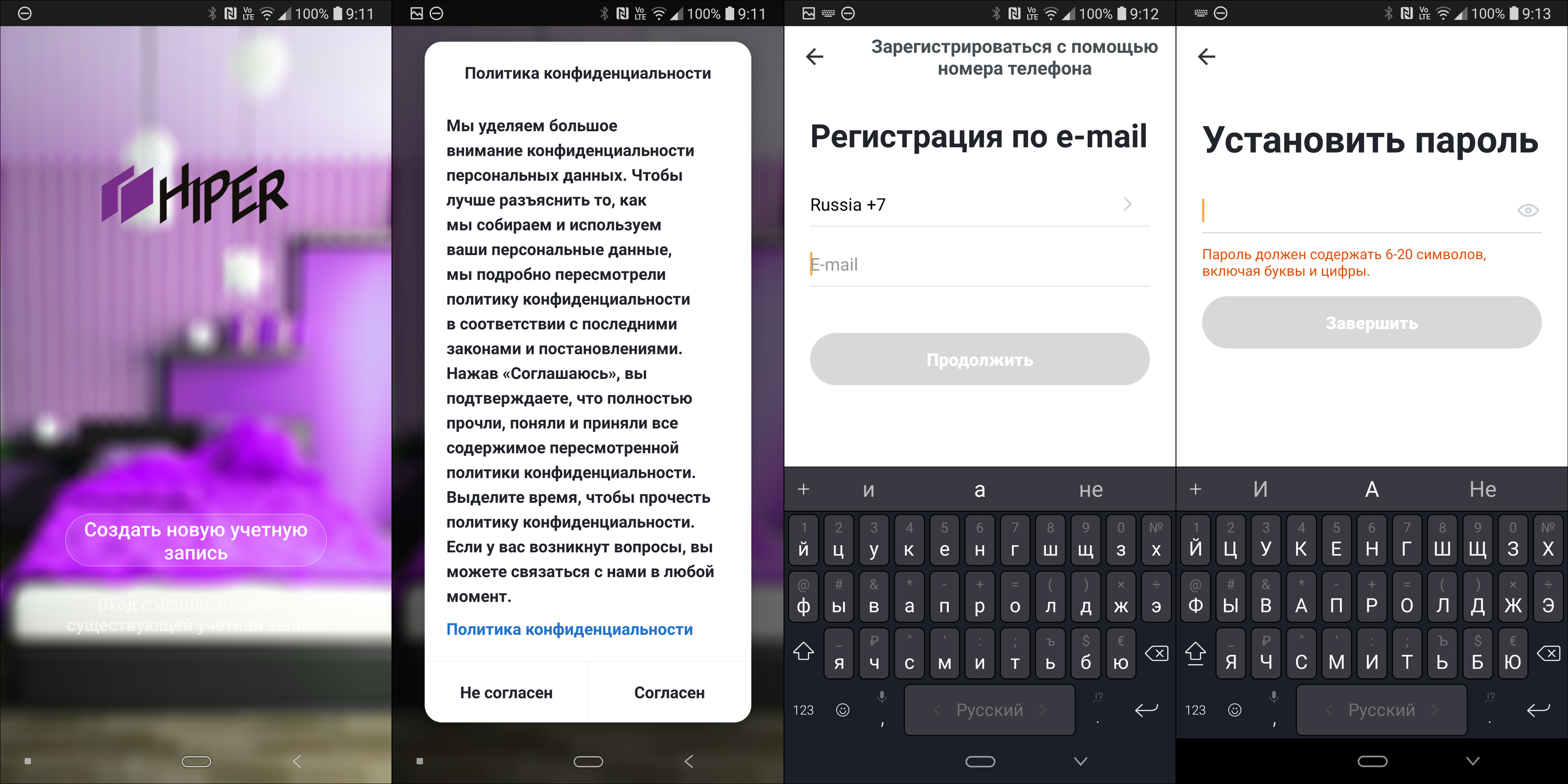 Первым делом нужно установить приложение Hiper IoT, доступное под Android и iOS. При первом входе пользователю предлагается принять правила использования и зарегистрироваться в облачном сервисе с помощью телефона или адреса электронной почты.