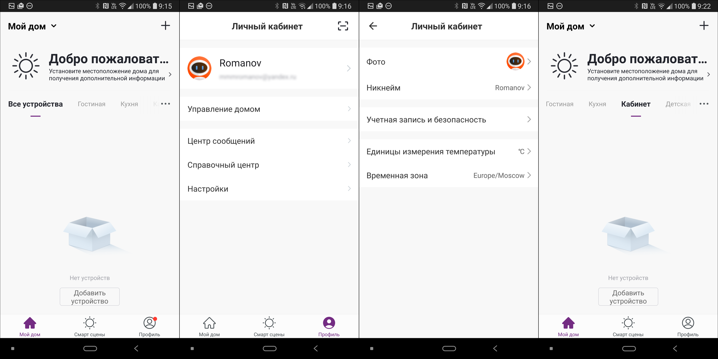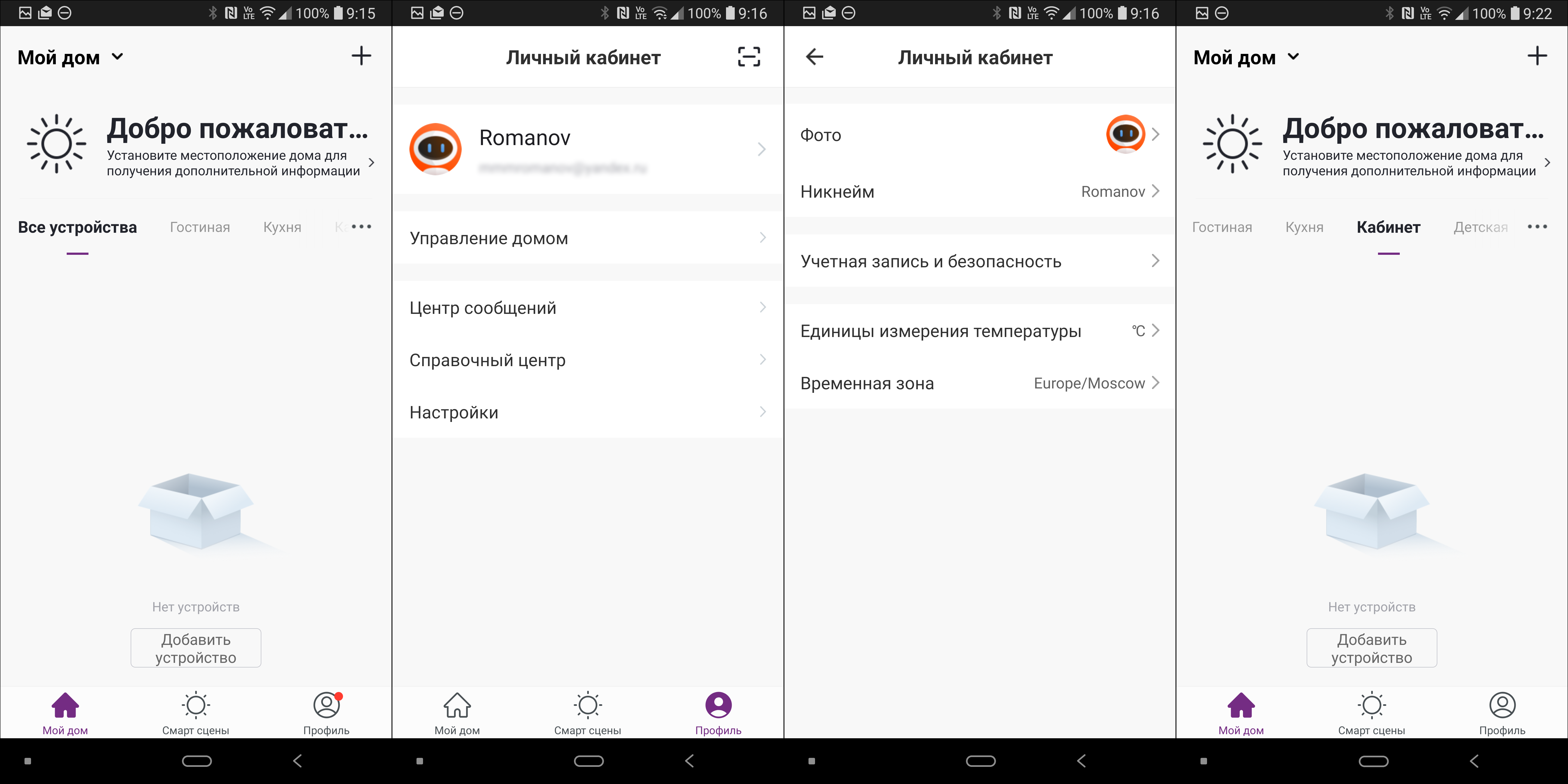 В личном кабинете пользователя можно уточнить персональные данные, изменить настройки интерфейса и так далее. В разделе с названием дома находим опцию добавления устройства — ею и воспользуемся чуть ниже. На примере первого подключаемого устройства мы подробно покажем процесс регистрации — он практически идентичен у всех приборов, различаются лишь способы активации у них режима подключения к сети.