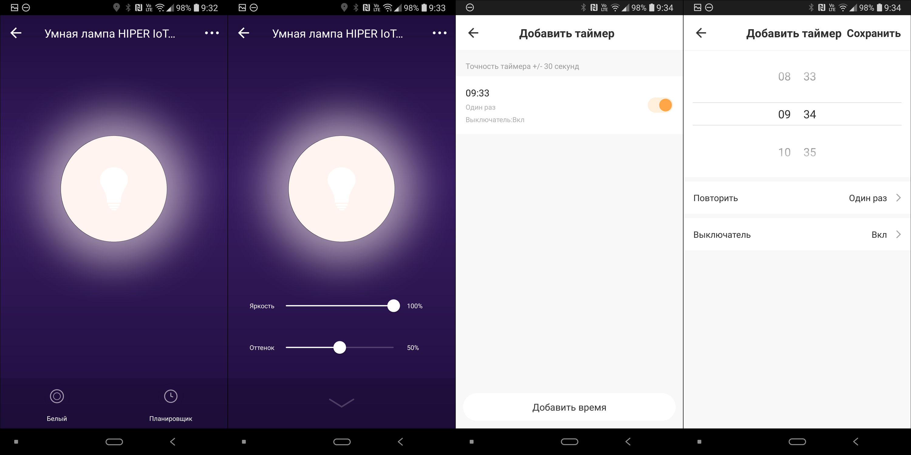 Внутри приложения яркость и цветовую температуру можно плавно изменять, перемещая соответствующие регуляторы. Там же можно добавить таймеры на включение и выключение.