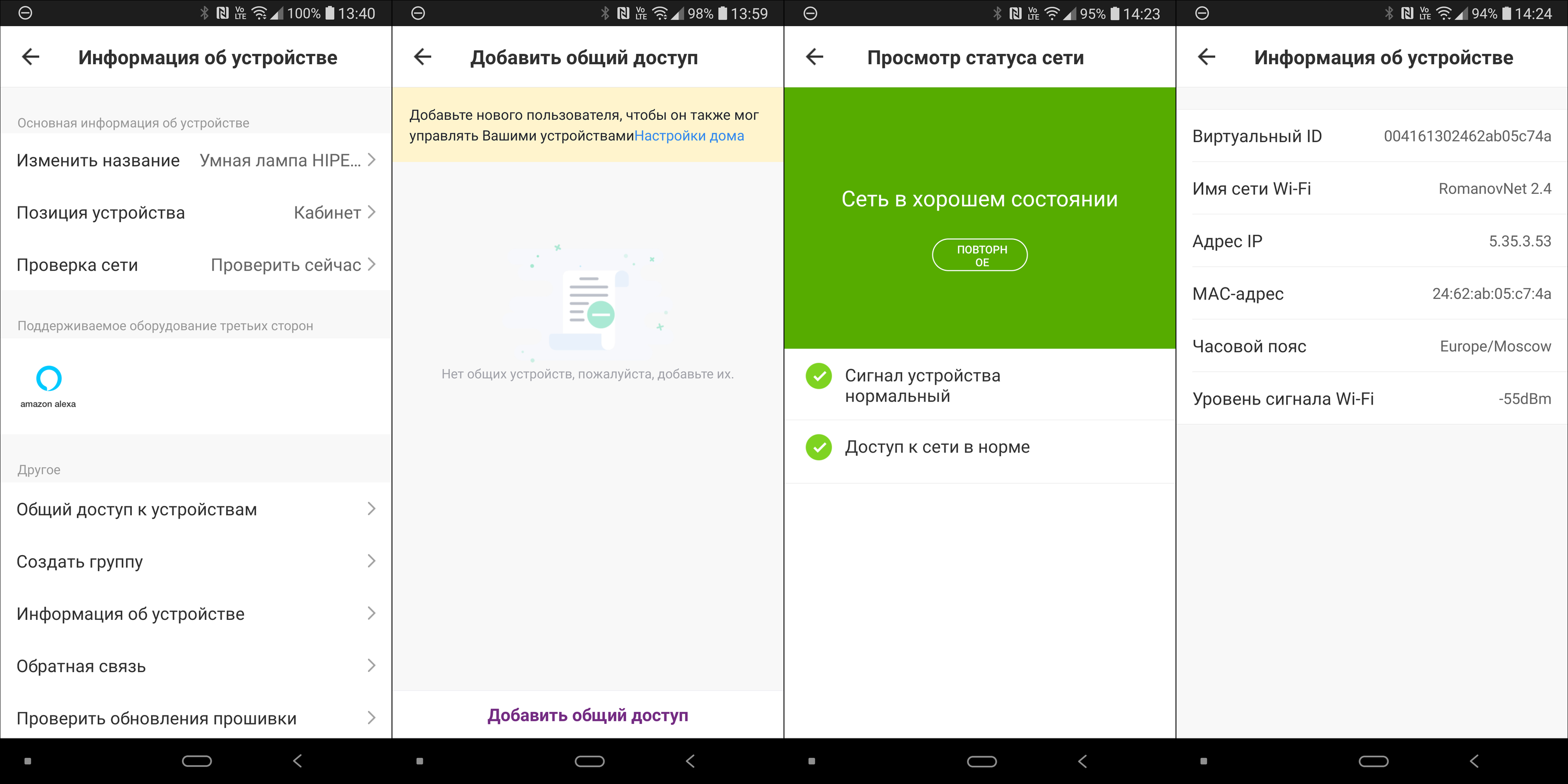 В разделе «Информация об устройстве» можно не только познакомиться с различными данными, но и настроить общий доступ к устройству. Одним и тем же домом, помещением или прибором могут управлять несколько пользователей из-под своих аккаунтов, раздача прав организована достаточно логично и удобно.