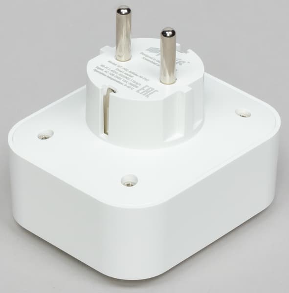 Логотип и служебная информация нанесены с нижней стороны на вилку устройства и не видны в подключенном состоянии. На округлой части корпуса расположена кнопка включения со светодиодным индикатором.