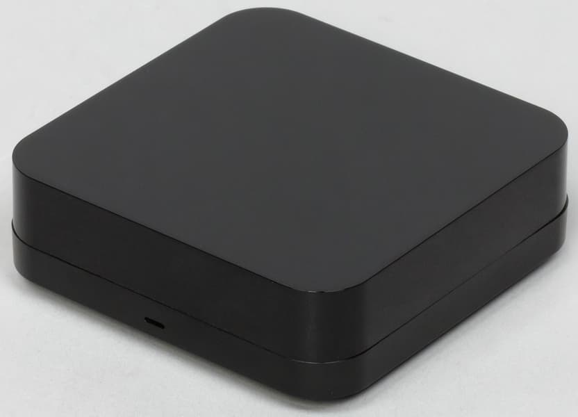 Пульт представляет собой квадрат с закругленными углами. Верхняя часть выполнена из глянцевого пластика, который легко «собирает» отпечатки пальцев. К счастью, часто трогать устройство не придется, так что это не станет проблемой.