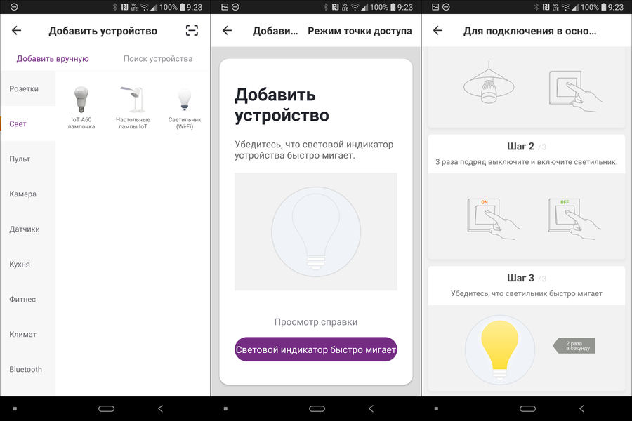 Как видно, использовать светильник можно и без подключения к сети. Но смысла в этом немного — через приложение им можно управлять гораздо более удобно и эффективно. Потому переходим в меню добавления устройств, находим там нужный раздел и наш светильник. Остается перевести его в режим поиска сети. Справка в приложении предложила нам включить устройство, потом включить-выключить три раза и ждать мигания.