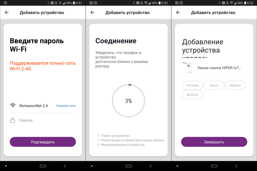Выбираем сеть, вводим пароль. Соединение занимает порядка 10 секунд, после чего система рапортует о том, что все готово, и предлагает сразу добавить устройство в одну из комнат. В приложении есть небольшие проблемы с версткой — часть предложений не помещается в экран. Так часто случается при переводе интерфейса на русский язык. Выглядит не очень аккуратно, но на работу не влияет. И, надеемся, будет поправлено в будущих версиях.