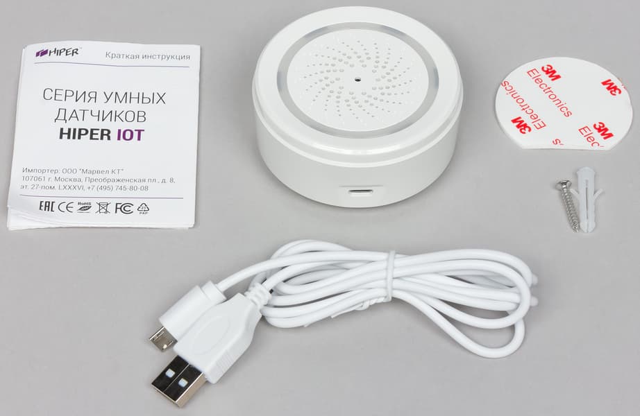 Поставляется сирена в комплекте с инструкцией, набором для крепления и кабелем USB—Micro-USB для подключения питания.