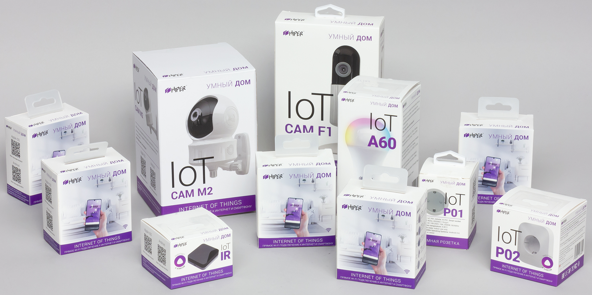 Все устройства серии IoT поставляются в красочно оформленных коробках из картона средней плотности, содержимое которых закреплено с помощью картонных же вставок. Сегодня мы поговорим обо всех представленных на фото ниже устройствах, кроме двух IP-камер — им в скором времени будет посвящено отдельное тестирование.