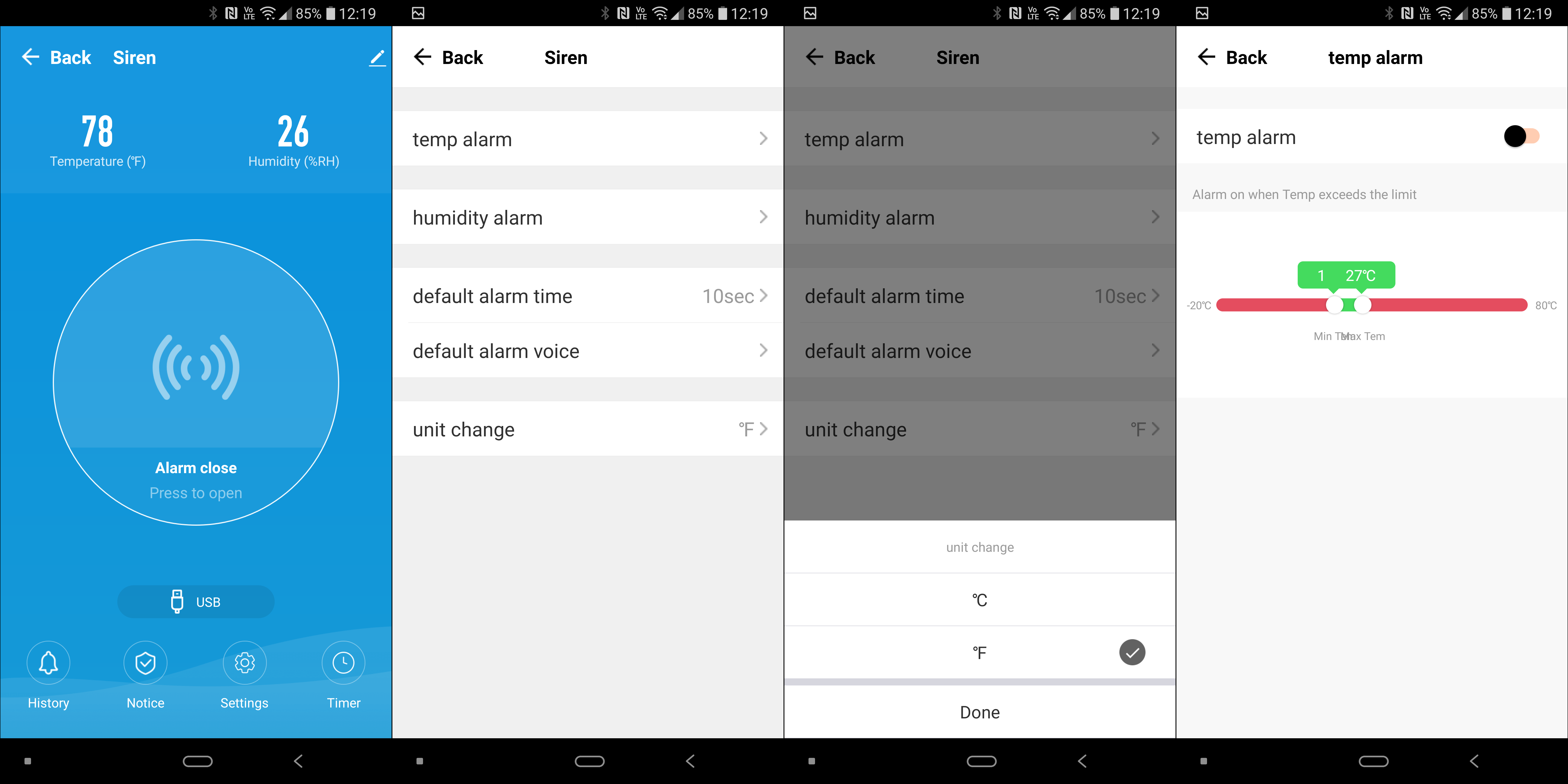 На вкладке устройства в приложении демонстрируются текущая температура и влажность, состояние сирены и тип питания — от USB или батарейки. По умолчанию для измерения температуры используются градусы Фаренгейта, а в настройках доступно переключение на градусы Цельсия. Там же можно включить звуковое оповещение при отклонении температуры или влажности от заданных параметров.