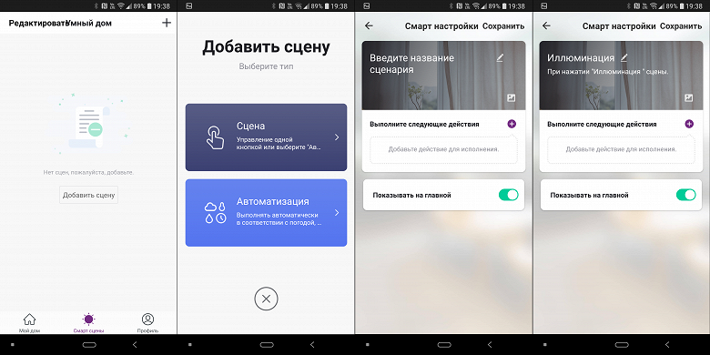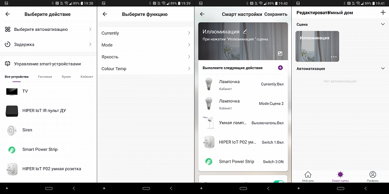 Далее выбираем действия. Например, включение лампочки. Потом активируем у нее ее собственный сценарий работы — сценарии можно «вкладывать» друг в друга. Также включаем одну из розеток, один из разъемов сетевого фильтра и настольную лампу. Сохраняем — наш сценарий готов и доступен на соответствующей странице.