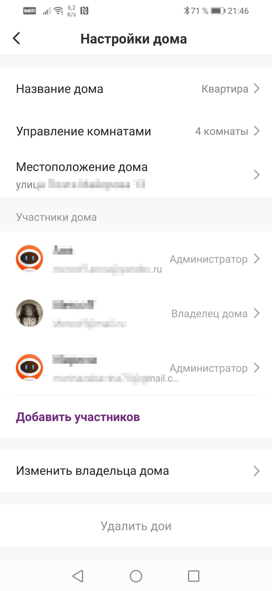 При первом запуске приложения необходима регистрация в системе, это не займет и минуты. Следующим логичным шагом будет создание домов и комнат в них. Было решено обойтись одним домом с несколькими комнатами. А чтоб не куковать в этом виртуальном доме в одиночку, мы добавили парочку пользователей, наделив их правами администраторов. Пусть развлекаются. Кстати, добавление пользователей производится несколькими разными путями, что значительно упрощает процесс.