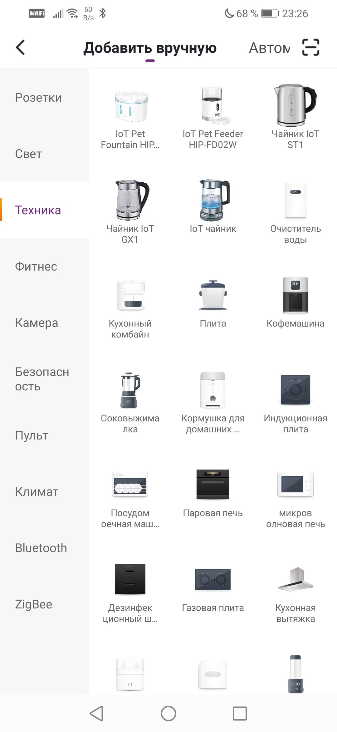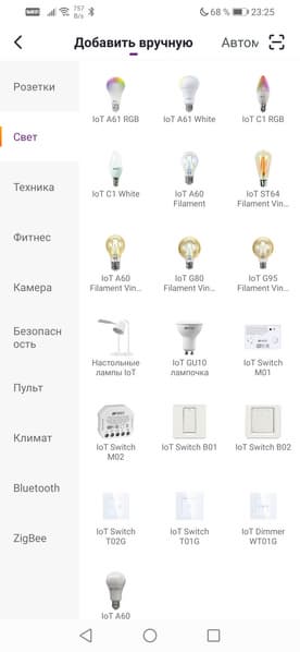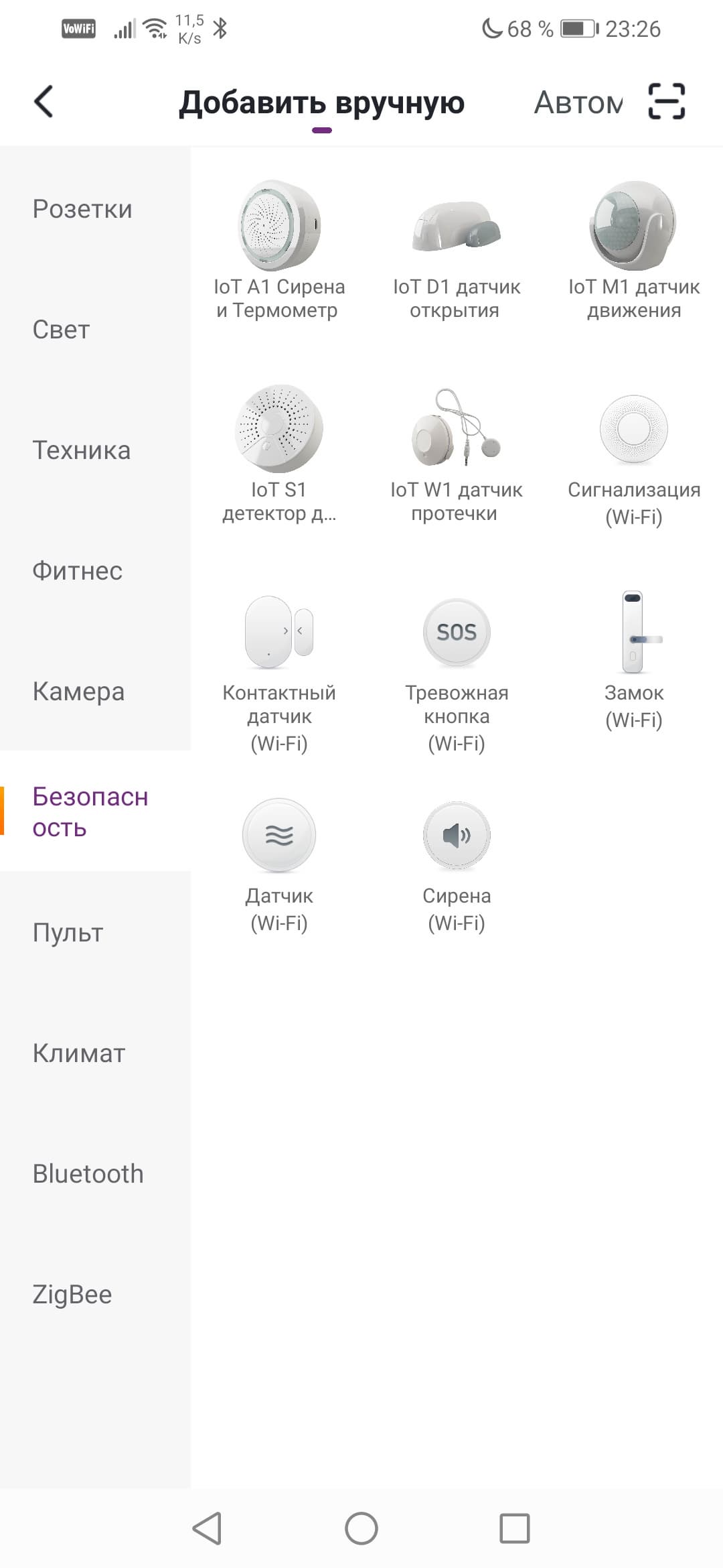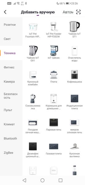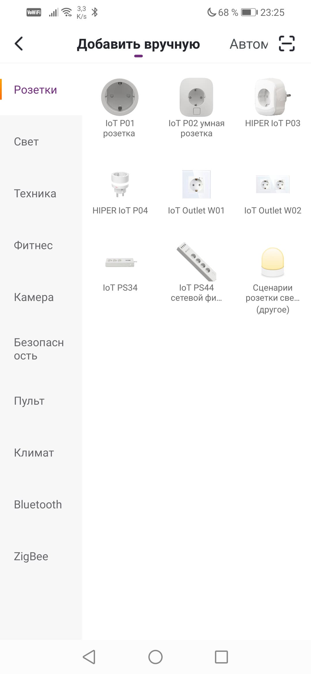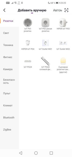 Вот теперь можно приступать к добавлению устройств. Их в копилке Hiper огромное количество. Все они разбиты по тематическим категориям, отыскать нужное не составит труда. Если же возникли затруднения, то к услугам пользователя в приложении имеется возможность автоматического добавления модулей путем сканирования локальной сети.