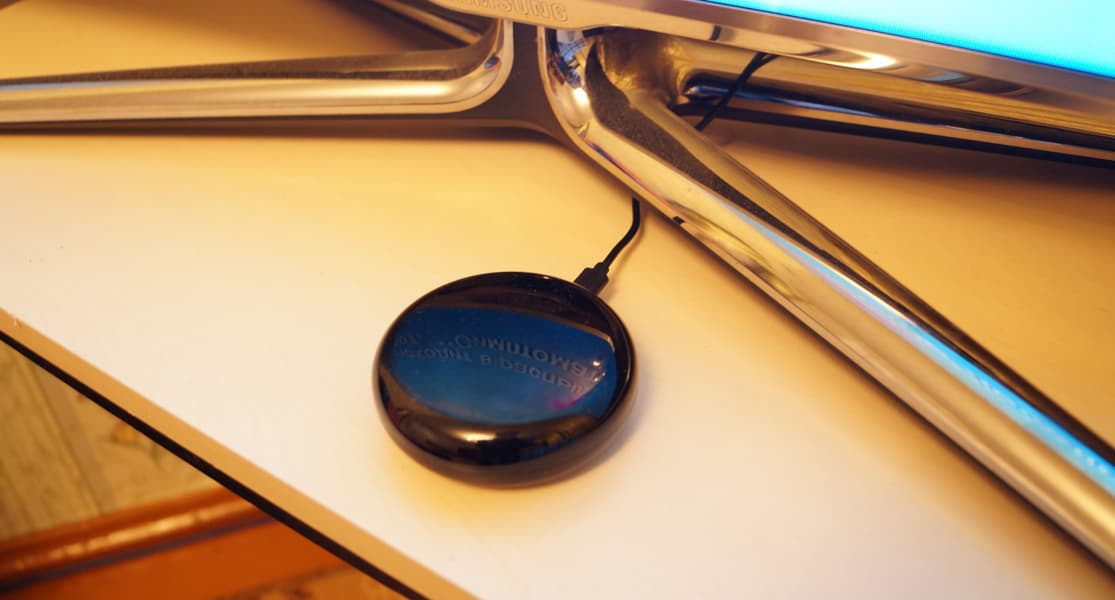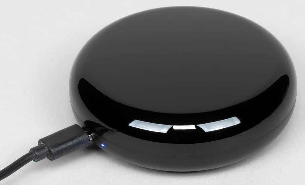 Глянцевый пухлый блинчик имеет разъем Micro-USB, по которому получает питание для работы. Рядом с разъемом находится светодиодная точка-индикатор, показывающая состояние гаджета.