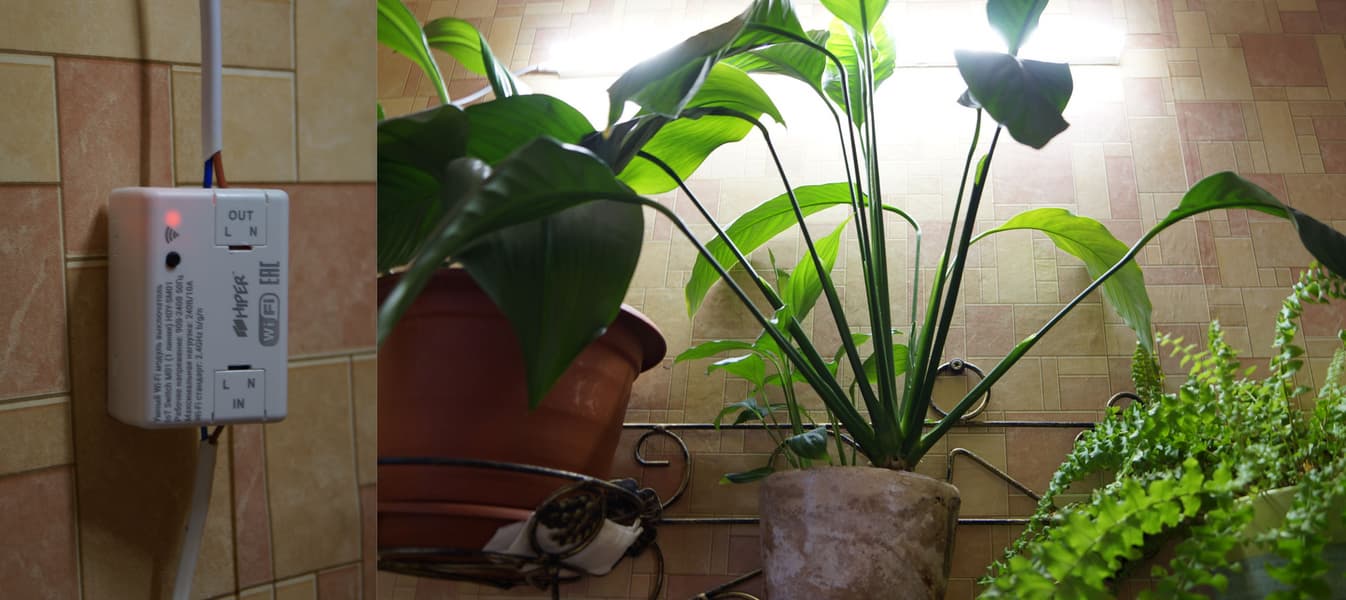Не меньшей заботы требуют и другие живые создания, которые любят фотографироваться (хотя, куда они денутся из своих горшков). Отсутствие нормального солнечного света с октября по май гибельно сказывается на домашней флоре. Ситуацию спасает лампа подсветки, но ее нужно включать и выключать. Каждый день. Нетрудно, однако часть времени (до трех дней в неделю) это делать просто некому. Ну, теперь есть кому. Умный переключатель Hiper IoT Switch M01 словно предназначен для такого сценария, к тому же монтируется он крайне несложно, в разрыв провода, идущего в светильник. Главное — не перепутать фазу с нулем.