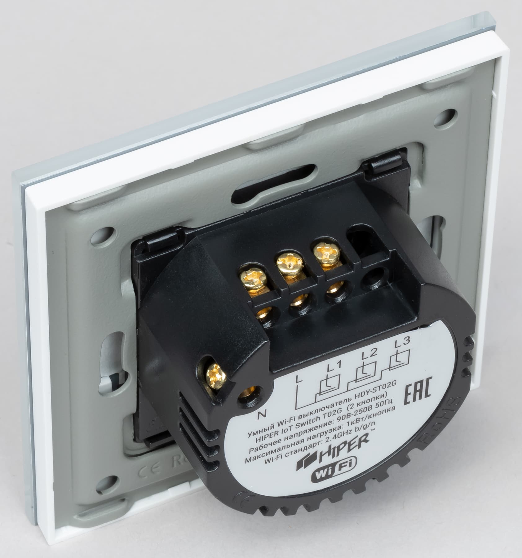 Схема подключения имеется на наклейке, более-менее сведущему человеку разобраться в ней не составит труда. Нулевой провод, который должен иметься в подрозетнике, подключается чуть сбоку, отдельно от основной фазной колодки. Остальные три контакта предназначены для фазных проводов: L — это вход фазы, а L1 и L2 — соответственно, выход на люстру.