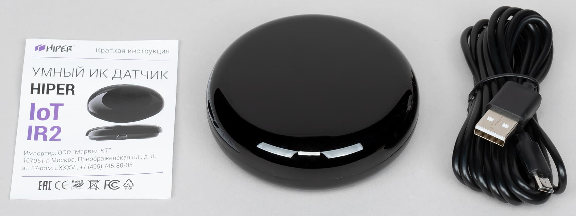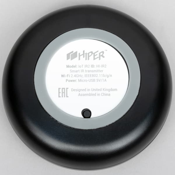 Розетка будет питать электричеством целый комплекс из трех устройств: телевизор, спутниковый приемник и инфракрасный передатчик Hiper IoT IR2. Мы его разместили под телевизором, поближе к потенциальным получателям сигнала, хотя, как впоследствии выяснилось, особо переживать за место размещения не стоит: мощность его инфракрасных светодиодов выше всяких похвал.