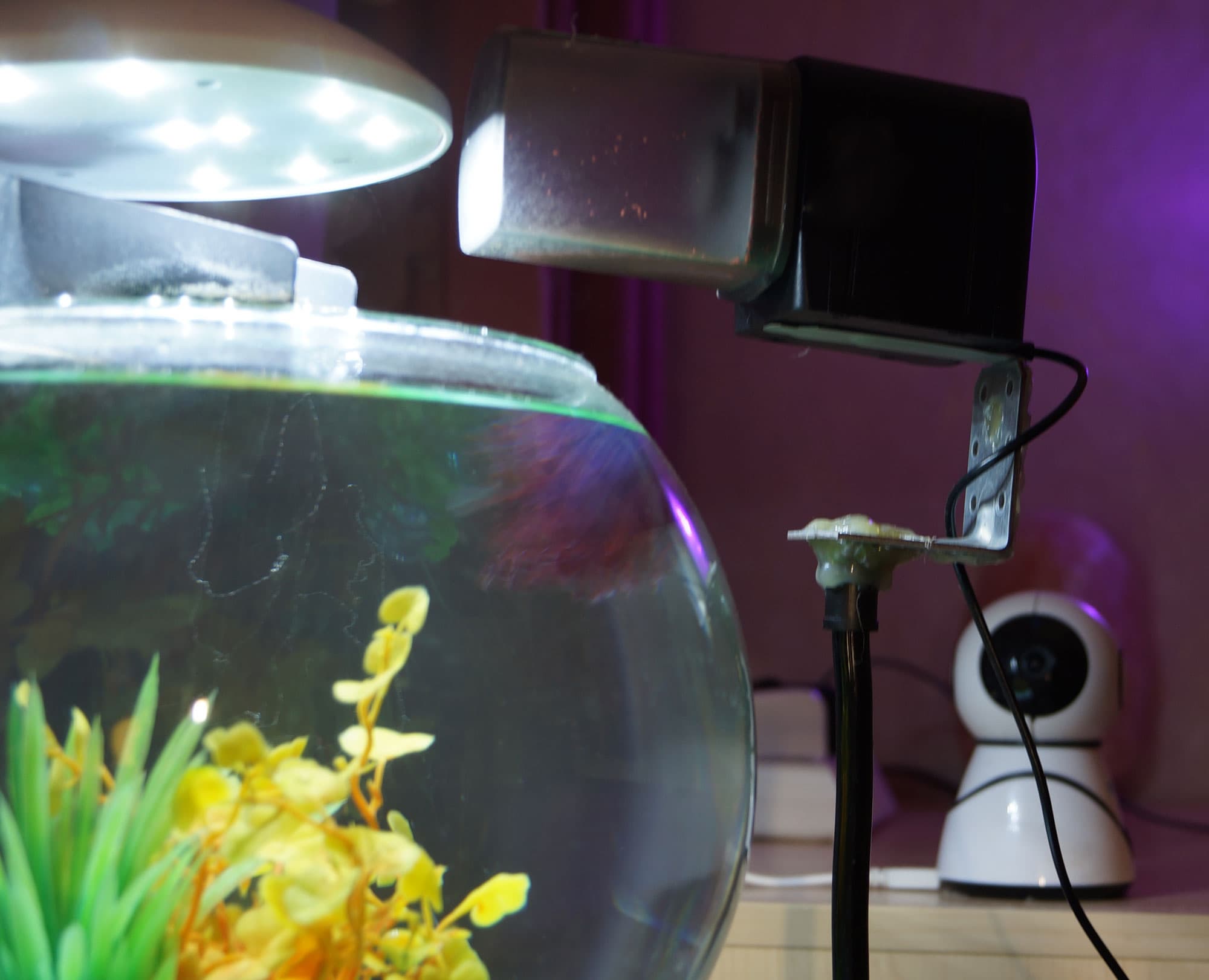 Подыскивая роль для умного сетевого фильтра, мы выяснили, что все имеющиеся компьютерные рабочие места уже давно оборудованы всем необходимым. Но такой раздатчик питания очень бы пригодился в одной из комнат, где, помимо других домочадцев, проживает Пират. Рыбка такая. Особая примета: не любит фотографироваться (на фото опять виден только его хвост). В дни, когда его никто не кормит, он отчего-то становится невесел. Чтобы такого больше не случалось, было приобретено все необходимое, включая автоматическую кормушку для рыб. А для обратной связи уже имеется поворотная IP-камерка. Но все эти приборы требуют разного питания, от 220 В до USB 5 В. И крайне желательно, чтобы это питание было контролируемым. То есть исходило бы из одного источника, которым можно рулить удаленно.