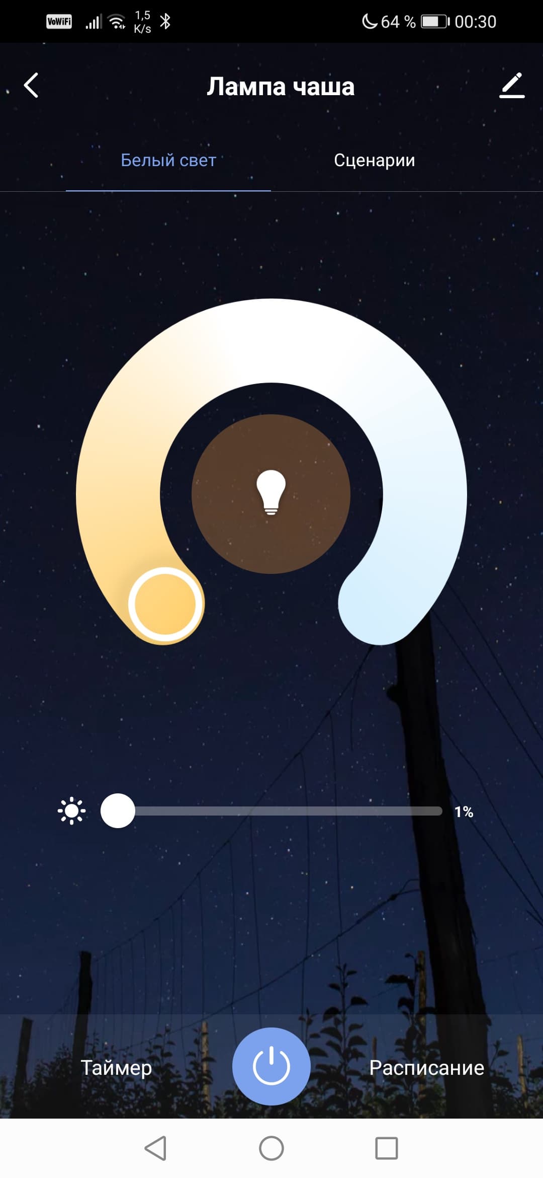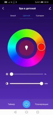 Другие особенности лампочек заключаются в наличии разных светодиодов, цветных (RGB) и двух типов белых с возможностью подстройки температуры от теплой к холодной. Встроенным диммером регулируется общая яркость, причем в любых режимах свечения, как в цветном, так и в белом. Что характерно, регулировка яркости производится почти без дискретности, с точностью до 1%. Конечно, заявленную яркость в 1% не следует понимать буквально. «Один процент от полного ноля» — это технически невозможно. На самом деле существует некий стартовый порог отсчета, который на глаз можно определить как 1/5 от максимальной яркости.